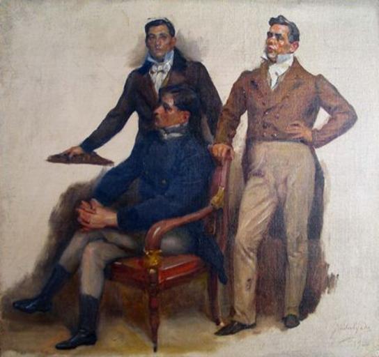 Keywords: Estudo de figuras humanas para a tela Cortes Constituintes de 1821 (José Ferreira de Moura, Agostinho José Freire, Manuel Borges Carneiro) - Veloso Salgado, 1920.png pt Estudo de figuras humanas para a tela Cortes Constituintes de 1821 de Veloso Salgado As três personagens são José Joaquim Ferreira de Moura o do meio representado de corpo inteiro está sentado numa cadeira de espaldar forrada de tecido vermelho com ornatos dourados nos braços recostado de pernas cruzadas e mãos juntas sobre o joelho esquerdo apresenta-se de frente para o espectador voltado a três quartos para a esquerda olhando na mesma direcção e veste farda de oficial de casaco azul escuro sem galões ou divisas calças claras e botas pretas de cano alto Agostinho José Freire o da esquerda está de pé representado a meio corpo de frente para o espectador representado em posição frontal vestindo casaco castanho e apoiando a mão direita nas costas de uma cadeira de pintura inacabada Manuel Borges Carneiro o homem da direita representado de corpo inteiro de frente para o espectador em posição frontal contraposta apoia a mão direita sobre as costas da cadeira da personagem sentada tem a mão oposta na anca veste fraque castanho dourado calças beges e sapatos rasos pretos Assinado e datado no canto inferior esquerdo V Salgado 1920 en Study of human figures for the painting The Constituent Courts of 1821 by Veloso Salgado The three characters are José Joaquim Ferreira de Moura the man in the middle depicted at full length sitting on a char with red upholstery sitting back with crossed legs and hands together over his left knee turned three-quarters to the left and looking in the same direction and wearing an officer's uniform with a dark blue coat with no decorations light trousers and black boots Agostinho José Freire the man on the left standing depicted at half-length and facing the viewer wearing a brown coat and with his right hand on the back of an unfinished chair and Manuel Borges Carneiro the man to the right depicted at full length facing the viewer with his right hand on the back of José Ferreira de Moura's chair and the other hand on his hip with a golden-brown coat beige trousers and black shoes Signed and dated on the lower left corner V Salgado 1920 1920 http //museu parlamento pt/MatrizWebAR/Objectos/ObjectosConsultar aspx IdReg 515 EntSep 5 MatrizPix - Museu da Assembleia da República Creator Veloso Salgado other versions Estudo de figuras humanas para a tela Cortes Constituintes de 1821 Agostinho José Freire - Veloso Salgado 1920 png Estudo de figuras humanas para a tela Cortes Constituintes de 1821 Manuel Borges Carneiro corpo inteiro - Veloso Salgado 1920 png Estudo de figuras humanas para a tela Cortes Constituintes de 1821 José Ferreira de Moura - Veloso Salgado 1920 png Custom license marker 2016 10 30 PD-old-70 José Joaquim Ferreira de Moura Agostinho José Freire Manuel Borges Carneiro Studies for As Cortes Constituintes de 1821 Veloso Salgado |