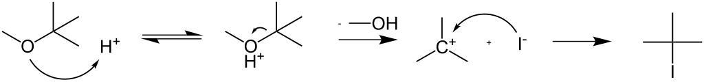 Keywords: Ether-cleavage-sn1.svg en Acid catalysed cleavage of an ether in an Sn1 reaction own Wampenseppl 2011-09-01 created with Inkscape validSVG Cc-zero Chemical reactions