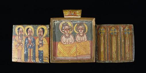 | Keywords: Ethiopian - Double-sided Diptych with Mary at Dabra Metmaq (Front); Saints (Back) - Walters 368 - Side B.jpg  The small scale of this painting and its protective covers facilitated its use as a portable icon The hollow wooden cylinder attached to the body allowed the painting to be suspended from the owner's neck The practice of wearing icons of the Virgin as pendants is documented in written sources as early as the fifteenth century The main scene on this doubled-sided pendant commemorates the feast of Däbrä Metmaq According to the Miracles of Mary this feast was instituted to celebrate an event that occurred annually in the church of Dayr al-Magtas Egypt For five days each spring Mary miraculously appeared inside the cupola of the church bathed in light and surrounded by angels The main panel of this icon captures the visionary character of this event by enclosing the Virgin in a band of yellow light Seraphim surround the outer border of red The archangels Michael and Gabriel depicted on the inside cover evoke the heavenly hosts that accompanied the Virgin By representing the major figures the painter recreated the miraculous apparition in miniature for the pendant's owner As the Festival of Däbrä Metmaq was especially important to women and as the reverse of the pendant also bears the likenesses of two female martyr-saints the patron of this work might have been female The legend of the 15th-century saint Krestos Sämra describes how Christ bequeathed to her a painting which he hung pendant-like around her neck The delicately carved painted covers transformed the closed pendant into a cherished object of personal devotion late Other date century 17 Gondarine tempera panel H open 4 3/8 x W 10 1/8 in 11 11 x 25 7 cm ; H closed 4 3/8 x W 3 5/8 in 11 11 x 9 2 cm ; Panel cm 8 09 8 25 accession number 36 8 342 Robert and Nancy Nooter Collection Washington D C date and mode of acquisition unknown Nooter 20 11 Walters Art Museum 1996 by purchase Museum purchase with funds provided by the W Alton Jones Foundation Acquisition Fund 1996 Ethiopian Art at The Walters The Walters Art Gallery Baltimore 1996 Realms of Faith Medieval and Byzantine Art from the Walters Art Museum Frist Center for the Visual Arts Nashville 2001-2002 Realms of Faith Medieval and Byzantine Art from the Walters Art Museum Frist Center for the Visual Arts Nashville 2002-2005 Angels of Light Ethiopian Art from the Walters Art Museum Birmingham Museum of Art Birmingham; Smith College Museum of Art Northampton; Museum of Biblical Art New York 2006-2007 place of origin Gondar Ethiopia Walters Art Museum license 3D Art of Ethiopia in the Walters Art Museum Church paintings in Ethiopia Paintings in the Walters Art Museum Media contributed by the Walters Art Museum needs category review |