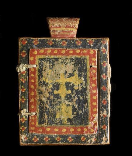 Keywords: Ethiopian - Front of a Double-Sided Diptych with Mary and Her Son, and Saint George - Walters 365 - Closed B.jpg This small icon was worn around the neck to ward off evil; it could be hung with either side facing out This is a small replica of the famous icon known as the Kwerata Reesu Christ with the Crown of Thorns believed to protect the whole kingdom of Ethiopia Allegiance to the emperor was sworn on the Kwerata Reesu and it accompanied him on military expeditions late Other date century 18 Gondarine tempera wood H with one panel open 3 7/16 x W 4 x D 5/8 in 8 7 x 10 1 x 1 55 cm ; H with two panels open 3 7/16 x W 5 9/16 x D 5/8 in 8 7 x 14 1 x 1 55 cm ; Closed cm 8 7 6 2 1 55 ; Center panel cm 8 89 6 35 ; Folding panels cm 5 87 4 76 accession number 36 5 35663 Knopfelmacher Collection New York date and mode of acquisition unknown Knopfelmacher 1 William Wright Gallery New York date and mode of acquisition unknown Walters Art Museum 1996 by purchase Museum purchase with funds provided by the W Alton Jones Foundation Acquisition Fund 1996 Ethiopian Art at The Walters The Walters Art Gallery Baltimore 1996 Realms of Faith Medieval and Byzantine Art from the Walters Art Museum Frist Center for the Visual Arts Nashville 2001-2002 Realms of Faith Medieval and Byzantine Art from the Walters Art Museum Frist Center for the Visual Arts Nashville 2002-2005 Angels of Light Ethiopian Art from the Walters Art Museum Birmingham Museum of Art Birmingham; Smith College Museum of Art Northampton; Museum of Biblical Art New York 2006-2007 place of origin Gondar Ethiopia Walters Art Museum license 3D Art of Ethiopia in the Walters Art Museum Church paintings in Ethiopia Paintings in the Walters Art Museum Media contributed by the Walters Art Museum needs category review