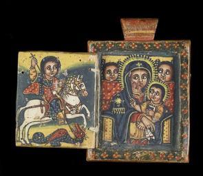 | Keywords: Ethiopian - Front of a Double-Sided Diptych with Mary and Her Son, and Saint George - Walters 365 - Open A.jpg This small icon was worn around the neck to ward off evil; it could be hung with either side facing out This is a small replica of the famous icon known as the Kwerata Reesu Christ with the Crown of Thorns believed to protect the whole kingdom of Ethiopia Allegiance to the emperor was sworn on the Kwerata Reesu and it accompanied him on military expeditions Late 18th century Gondarine tempera wood H with one panel open 3 7/16 x W 4 x D 5/8 in 8 7 x 10 1 x 1 55 cm ; H with two panels open 3 7/16 x W 5 9/16 x D 5/8 in 8 7 x 14 1 x 1 55 cm ; Closed cm 8 7 6 2 1 55 ; Center panel cm 8 89 6 35 ; Folding panels cm 5 87 4 76 accession number 36 5 35663 Knopfelmacher Collection New York date and mode of acquisition unknown Knopfelmacher 1 William Wright Gallery New York date and mode of acquisition unknown Walters Art Museum 1996 by purchase Museum purchase with funds provided by the W Alton Jones Foundation Acquisition Fund 1996 Ethiopian Art at The Walters The Walters Art Gallery Baltimore 1996 Realms of Faith Medieval and Byzantine Art from the Walters Art Museum Frist Center for the Visual Arts Nashville 2001-2002 Realms of Faith Medieval and Byzantine Art from the Walters Art Museum Frist Center for the Visual Arts Nashville 2002-2005 Angels of Light Ethiopian Art from the Walters Art Museum Birmingham Museum of Art Birmingham; Smith College Museum of Art Northampton; Museum of Biblical Art New York 2006-2007 place of origin Gondar Ethiopia Walters Art Museum license 3D Art of Ethiopia in the Walters Art Museum Church paintings in Ethiopia Paintings in the Walters Art Museum Media contributed by the Walters Art Museum needs category review |
