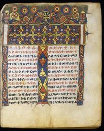 | Keywords: Ethiopian - Leaf from Gunda Gunde Gospels - Walters W85097R - Open Obverse.jpg ca 1540 Stephanite parchment with ink and tempera paint cm 30 24 5 accession number W 850 97R 27600 Church Mädhane Aläm at Mäjate Ethiopia 1892-1893 mode of acquisition unknown Private collection France prior to 1973 mode of acquisition unknown Sam Fogg London date and mode of acquisition unknown Walters Art Museum 1998 by purchase Museum purchase with funds provided by the W Alton Jones Foundation Acquisition Fund 1998 Illuminating the Word Gospel Books in the Middle Ages The Walters Art Museum Baltimore 2004 The Saint John's Bible A Modern Vision through Medieval Methods The Walters Art Museum Baltimore 2009 place of origin Ethiopia Walters Art Museum license 2D Walters MS W850 - Ethiopian Gunda Gunde Gospels |