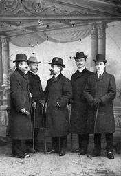 | Keywords: Ethnic Greeks of Monastir Bitola.JPG  en Commemorative photograph of Greek Macedonian officials of the Consulate in Monastir modern Bitola From left to right N Kontogouris P Sarros V Agorastos Y Honaios and S Polihroniadis All of them dressed in formal attire posing indoors in an urban photograph el Αναμνηστική φωτογραφία των  ροξενικών υ αλλήλων του  ροξενείου  οναστηριου Α ό αριστερά  ρος τα δεξία διακρίνονται ο  Κοντογούρης Π Σαρρός Β Αγοραστός Γ Χωναίος και ο Σ Πολυχρονιάδης ο Β Αγοραστός ήταν υ άλληλος Ο  Κοντογούρης έλληνας αξιωματικός  ου διοργάνωνε το αγωνιστικό-  ατριωτικό κέντρο του  οναστηρίου χρησιμο οιούσε την ιδιότητα του  ροξενικού υ αλλήλου ως  ρόφαση για να κρύψει την εθνική του δράση Όλοι τους ντυμένοι με αστική ε ίσημη ενδυμασία  οζάρουν σε εσωτερικό χώρο φωτογραφείου Г ците во  акедонија http //www imma edu gr/imma/dbs/Artifacts/index html lq CE A0 CE 93 CE 94 CE 9C start 536 show 1 Author Late 19th-early 20th Century Anonymous-EU People of Bitola Macedonians Greeks Georgios Honaios |