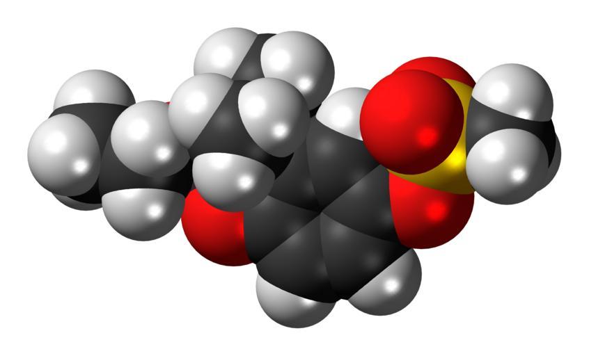 | Keywords: Ethofumesate-3D-spacefill.png Space-filling model of the ethofumesate molecule a herbicide Colour code 505050 Carbon C black<br> F0F0F0 Hydrogen H white<br> F51E1E Oxygen O red<br> FAEB00 Sulfur S yellow<br> 2011-01-21 own <br> DS Visualizer Jynto talk Ball-and-stick version cc-zero Mesylate esters Benzodihydrofurans Acetals Ethyl ethers Herbicides Images by Jynto Space-filling models | ||||