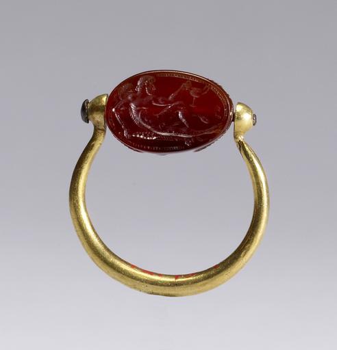 Keywords: Etruscan - Gem with Herakles at Rest - Walters 42494 - Back.jpg This gem shows Herakles reclining to left resting on the lion skin The lion tail is visible between the hero's legs while fur and paw appear behind his back and below his right leg His right hand rests with the club on the ground next to him while he raises a large kantharos with his left in front or him A palm tree behind the hero indicates scenery Depictions of Herakles reclining are attested as early as the 6th century BC but the sculptural type was introduced only in the 4th century BC It shows the almost always aged and bearded hero resting from his labors and as symposiast associating him with the world of Dionysos It became a popular and widespread theme in Hellenistic and Roman times see LIMC 4 1988 s v Herakles 777 1st half 5th century BC carnelian set in a modern gold ring Ring H 3/8 x W 1 x D 1in 1 x 2 54 x 2 54cm ; Gem cm 1 1 5 accession number 42 494 8268 Henry Walters Baltimore date and mode of acquisition unknown Walters Art Museum Henry Walters Acquired by Henry Walters Heroes Mortals and Myths in Ancient Greece The Walters Art Museum Baltimore; Frist Center for the Visual Arts Nashville; San Diego Museum Of Art San Diego; Alexander S Onassis Public Benefit Foundation USA New York 2009-2011 place of origin Etruria in present-day Italy Walters Art Museum license Etruscan art in the Walters Art Museum Jewellery in the Walters Art Museum Heracles in Etruscan art Heracles as an old man Heracles wearing Nemean lion fur skin |