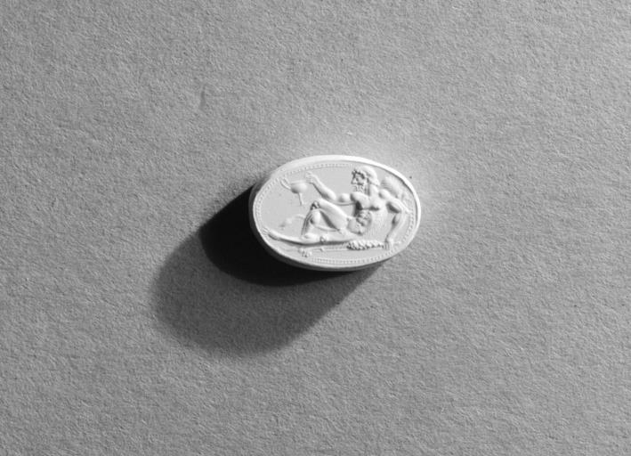 Keywords: Etruscan - Gem with Herakles at Rest - Walters 42494 - Impression.jpg This gem shows Herakles reclining to left resting on the lion skin The lion tail is visible between the hero's legs while fur and paw appear behind his back and below his right leg His right hand rests with the club on the ground next to him while he raises a large kantharos with his left in front or him A palm tree behind the hero indicates scenery Depictions of Herakles reclining are attested as early as the 6th century BC but the sculptural type was introduced only in the 4th century BC It shows the almost always aged and bearded hero resting from his labors and as symposiast associating him with the world of Dionysos It became a popular and widespread theme in Hellenistic and Roman times see LIMC 4 1988 s v Herakles 777 1st half 5th century BC carnelian set in a modern gold ring Ring H 3/8 x W 1 x D 1in 1 x 2 54 x 2 54cm ; Gem cm 1 1 5 accession number 42 494 8268 Henry Walters Baltimore date and mode of acquisition unknown Walters Art Museum Henry Walters Acquired by Henry Walters Heroes Mortals and Myths in Ancient Greece The Walters Art Museum Baltimore; Frist Center for the Visual Arts Nashville; San Diego Museum Of Art San Diego; Alexander S Onassis Public Benefit Foundation USA New York 2009-2011 place of origin Etruria in present-day Italy Walters Art Museum license Etruscan art in the Walters Art Museum Jewellery in the Walters Art Museum Heracles in Etruscan art Heracles as an old man Heracles wearing Nemean lion fur skin |