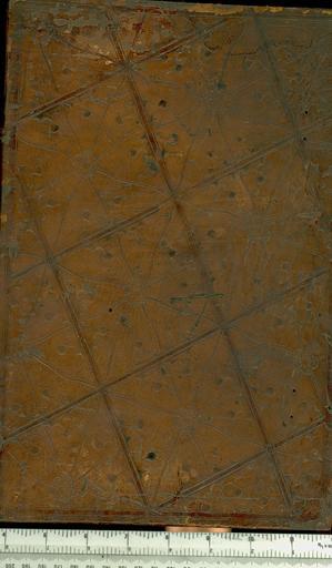 | Keywords: Etymologiae--Augsburg-- Günther Zainer, 19 Nov. 1472- - Lower cover (I.B.5441).jpg Style Single tools design All over design Lozenge or diamond; Caption Lower cover; Colour Brown; Edge Title in ink on top edge exhibition history Decorative Technique Tooled in blind; Cover Material Goatskin includes morocco turkey etc Wooden boards Traces of 2 pairs of clasps Goff I181; H 9273 ;BMC II 317 Some tools similar to Salzburg St Peter IV Meister des Johann Walgungsberger Walgungsberger-Meister Ink ms notes; object history Text 1472; Augsburg; Scheyern Benedictine Abbey object type Cc-zero place of creation Binding Germany place of discovery Unspecified British Library image http //www bl uk/catalogues/bookbindings/LargeImage aspx RecordId 020-000014817 ImageId ImageId 54233 Copyright BL Etymologiae Augsburg Günther Zainer 19 Nov 1472 Uploaded with GWToolset Etymologiae Augsburg Günther Zainer 19 Nov 1472 - Lower cover I B 5441 http //www webarchive org uk/bldatasets/bindings/ib5441L jpg Bookbinding 15th-century bookbinding British Library Bookbindings Scanned with HP ScanJet 8200 |
