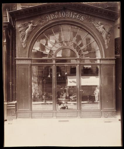 | Keywords: Eugène Atget, Antique Store, 21 Faubourg St.-Honoré - Getty Museum.jpg Artwork en This study of a shop window in Paris unites interior with exterior in an intriguing juxtaposition of reflections and objects The sidewalk which is completely overexposed in the foreground is revealed in detail in the reflection of the shop window A clear depiction of the photographer at work is also evident Eugène Atget appears in profile standing at his camera in the lower-center pane of the shop window as though he is a miniature automaton prominently placed for sale It is almost impossible in fact to tell where the reflection of the street ends and the contents of the shop begin A lamppost appears to be up for sale alongside a mantel clock; a wagon wheel is displayed just under a cherub to the right of the vases The overlapping of the contents of the antique store with the everyday objects of the rapidly urbanizing city suggests that Atget was making a commentary about the reduction of Old Paris into nothing more than a collection of curios circa 1902 Albumen silver print Image 21 7 x 17 9 cm 8 9/16 x 7 1/16 in Institution Getty Museum object history exhibition history other versions 70733 Inscription Inscribed verso print in pencil title and negative number 4556 Secondary Inscription Inscribed verso print in red crayon in unknown hand dealer's inventory number 10 credit line accession number 90 XM 120 PD-old-auto 1927 1902 in Paris 1902 photographs Photographs of Paris by Eugène Atget Photographs in the Getty Museum Antique shops in Paris Shop windows in Paris Rue du Faubourg-Saint-Honoré Paris |