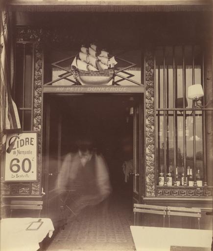 | Keywords: Eugène Atget, Quai Conti 3 - Getty Museum.jpg Artwork en Au Petit Dunkerque a bar in Paris was bustling with business when Eugène Atget stood directly in front of the entrance to document it The name of the establishment is subordinated to the sailing ship above it a leftover from old Paris when many businesses advertised with images rather than words because of their largely illiterate clientele A trellis of grapes grows around the doorframe and heavily barred windows then a Parisian requirement for premises that sold alcohol By contrast the open door is a deep black chasm from which emerges a truncated headless ghost in a white shirt and waistcoat Due to their excessive motion during the exposure his head and legs have disappeared into a hopeless blur The striped fabric along the top left edge and the fringe on the folded-back awning across the top of the image create a frame for the facade 1900 Albumen silver print Image 20 8 x 17 9 cm 8 3/16 x 7 1/16 in Institution Getty Museum object history exhibition history other versions 69917 Atget negative number inscribed in negative Title and negative number 4133 and Ancien magasin de bijouterie/de Marie Antoinette/au petit Dunkerque inscribed verso in pencil credit line accession number 90 XM 45 1 PD-old-auto 1927 1900 in Paris 1900 photographs Photographs of Paris by Eugène Atget Photographs in the Getty Museum Quai de Conti Paris Bars in Paris |