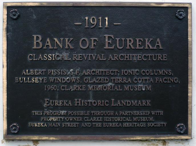 | Keywords: Eureka CA Bank of Eureka Eureka Plaque.jpg en Built in Classical Revival style in 1911 the Bank of Eureka in Eureka California was listed on the National Register of Historic Places in 1982 is a City of Eureka Historical Landmark and is now the Clarke Memorial Museum Eureka Historic Landmark Plaque reads 1911- Bank of Eureka - Classical Revival Architeture - Albert Pissis S F Architect; Ionic Columns Bullseye Windows Glazed Terra Cotta Facing 1960 Clarke Memorial Museum - Eureka Historic Landmark - This program possible through a partnership with property owner Clarke Historical Museum Eureka Main Street and the Eureka Heritage Society own Ellin Beltz 40 48 13 N 124 9 59 W region US 82002180 Bank buildings in California Commercial buildings on the National Register of Historic Places in California 1910s architecture Built in California in 1911 History museums in California Museums in Eureka California Historical markers in Humboldt County California Taken with Panasonic Lumix DMC-FX12Photographs by Ellin Beltz |