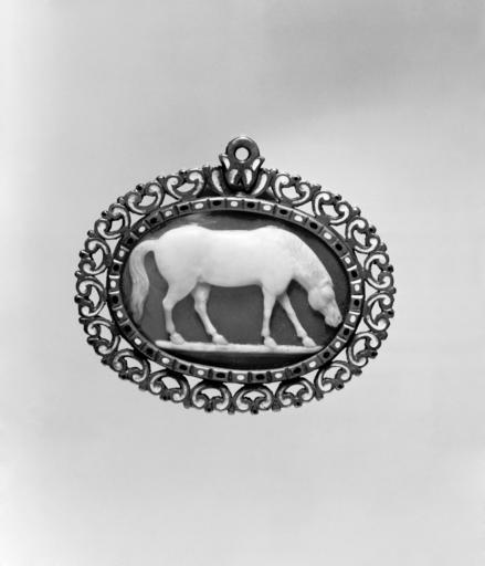 Keywords: European - Cameo with Horse Grazing - Walters 42145.jpg A cameo is a small stone or shell carved in raised relief The stone could be precious or semi-precious and of a single color or veined with different colors- such as onyx with white veins that could be distinguished for a striking effect as here The techniques were developed in the ancient world and the subjects are often taken from the classical tradition The market for antiquities was great in the 16th century; since the differences between a Roman and a particularly ingenious 16th-century imitation were hard to distinguish many modern pieces were offered as antiques between 1525 1600 Renaissance onyx enamel copper alloy gilt mount cm 6 1 6 9 accession number 42 145 38516 Henry Walters Baltimore date and mode of acquisition unknown Walters Art Museum Henry Walters Acquired by Henry Walters Jewelry - Ancient to Modern The Walters Art Gallery Baltimore 1979-1980 Objects of Adornment Five Thousand Years of Jewelry from the Walters Art Gallery Baltimore Cooper-Hewitt National Design Museum New York; Chrysler Museum of Art Norfolk; Carnegie Museum of Art Pittsburgh; San Antonio Museum of Art San Antonio; Philbrook Museum of Art Tulsa; Honolulu Academy of Arts Honolulu; New Orleans Museum of Art New Orleans; Milwaukee Art Museum Milwaukee; Minneapolis Institute of Arts Minneapolis; Toledo Museum of Art Toledo; The John and Mable Ringling Museum of Art Sarasota 1984-1987 Jewelry from the Walters Art Museum and the Zucker Family Collection The Walters Art Gallery Baltimore 1987 place of origin Europe Walters Art Museum license Renaissance applied arts in the Walters Art Museum Art from Europe Cameos Grazing horses |