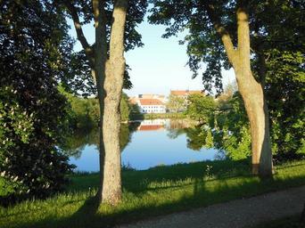 Keywords: evening atmosphere castle lake city light and shade trees nyborg fuen denmark town hall church spiers castle mill mirror grass