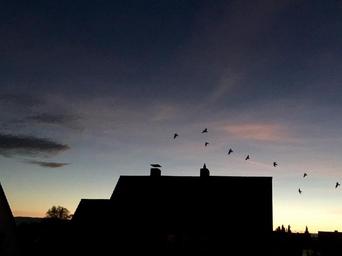 Keywords: evening sky homes birds bird flight chimney roofs clouds sky sunset sun building city architecture nature landscape romantic mood atmospheric atmosphere