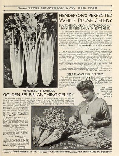 | Keywords: Everything for the garden (15768375984).jpg From PETEK MEMBEIRSOM ® CO C9 MEW YOl <br> 27 <br> henderson's perfected <br> White Plume Celeky <br> BLANCHES QUICKLY AND THOROUGHLY <br> MAY BE USED EARLY IN SEPTEMBER <br> This is the oldest of the self-blanching sorts and is still immensely <br> popular It is by far the most attractive of all in appearance and <br> grows so easily that it should find a place in every garden Under <br> ordinary conditions and if started early it may be ready to blanch <br> early in September and be fit for use a few days later Its slim <br> delicately brittle stalks surmounted with their graceful ornamental <br> foliage are unsurpassed from a decorative standpoint while its <br> delicious flavor and crisp tenderness captivate the most fastidious <br> appetite See cut Price 10c pkt 45c oz 1 60 \i lb 6 00 lb <br> We found your White Plume Celery seed perfect in germination <br> JACOB NEY Jr Siege Cal <br> I had the finest crop of Henderson's White Plume Celery last fall ever raised in <br> this section and so acknowledged by every one who saw it Had plenty of stalks <br> pure while two feet long crisp and elegant 0 G BRIAN Dykmans N Y <br> After experience in Celery culture for many years your White Plume Celery <br> was the best we ever had The stalks were white from root to leaf and when prepared <br> for the table measured twenty-three inches Everybody said it was the most beautiful <br> Celery they ever saw T B McILWAIN Napier Ont Can <br> Have always been told that the White Plume Celery was not a good keeping <br> variety We used the last of ours on April 2d and it was in fine condition flavor <br> as fine as ever Raised from seed purchased from you last year <br> Miss KATHER1NE GLENN Linesville Pa <br> Your White Plume Celery that I had last season was good I do not think there <br> were over one hundred plants in two acres that went to seed <br> WILSON BURR Broadalbin N Y <br> SELF BLANCHING CELERIES <br> This is the name given to a number <br> of varieties which by reason of theiry <br> earliness and the short time <br> required for the blanch- <br> ing process are indis- <br> pensable for the earliest t <br> crops <br> HENDERSON'S SUPERIOR <br> GOLDEN SELF-BLANCHING CELERY <br> An excellent variety of French origin This is the variety grown largely for market <br> but it is equally valuable for the private garden It is very early blanches quickly and <br> its rich color makes it quite attractive The habit of the plant is short and stocky; <br> the stalks are broad thick and very solid It develops a large heart quite early <br> in its growth which makes the <br> greater part of the plant edible <br> It is fit for use early in Septem- <br> ber and remains in use until <br> the 'later winter sorts mature <br> See cut Price 15c pkt 2 00 <br> oz 7 00 \i lb <br> Henderson's seeds have given fine <br> results here in Billings Our Golden <br> Self-blanching Celery grown from Hen- <br> derson's seed has attracted special atten- <br> tion Have increased our crop from <br> twenty thousand in 1911 to one hundred <br> thousand in 1913 and will plant a larger <br> crop in 1914 than ever <br> WELLER CISSEL <br> R D No 1 Billings Mon <br> Just a few words of esteem regarding <br> your Self-blanching Celery It certainly <br> was fine crisp and tender Every seed <br> must have grown <br> Mrs H WHITEHEAD <br> Easton Pa <br> Want to say that this is my fifth <br> successive year in buying of you your <br> superior Golden Self-blanching Celery <br> seed and each time so far I have had <br> good success and for that reason I am <br> buying of you again <br> G J HAFENDORFER <br> Greeley Colo <br> Their value is so pronounced <br> that probably go per cent of <br> 11 the Celery marketed in <br> the United States is of <br> this class <br> -OUR LEAFLET <br> CELERY CULTURE <br> FOR HOME AND <br> MARKET- <br> SENT FREE IF <br> ASKED FOR <br> faS SSr Peter Henderson in 1847 <br> founded by <br> is now carried on <br> by his son <br> Charles Henderson gr n n d S h ons Peter and Howard M Henderson 43874819 149634 78295 Page 27 Text http //www biodiversitylibrary org/page/43874819 c1915 10 5962/bhl title 78295 Henry G Gilbert Nursery and Seed Trade Catalog Collection ; Peter Henderson Co Biodiversity Heritage Library Everything for the garden 1915 Garden Stories Books Bulbs Plants Catalogs Equipment and supplies Flowers Gardening Lawn mowers Seeds U S Department of Agriculture National Agricultural Library bhl page 43874819 dc identifier http //biodiversitylibrary org/page/43874819 bhlGardenStories BHLinbloom bulbs plants u s department of agriculture national agricultural library bhlgardenstories bhlinbloom Information field Flickr posted date ISOdate 2015-01-28 Check categories 2015 August 25 CC-BY-2 0 BioDivLibrary https //flickr com/photos/61021753 N02/15768375984 2015-08-25 03 00 37 cc-by-2 0 PD-old-70-1923 Everything for the garden 1915 Photos uploaded from Flickr by Fæ using a script |