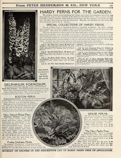 | Keywords: Everything for the garden (15768648674).jpg feathery <br> plumy; nothing describes them better <br> than Ostrich Plumes This is the best <br> of the type Price from 2-inch pots <br> 10c each 1 00 per doz ; 3-inch pots <br> 20c each 2 00 per doz ; 4-inch pots 35c <br> each; 5-inch pots 50c each; 6-inch pots <br> 75c each 7-inch pots 1 25 each <br> Funkia Undulata Media <br> The variegated 'Plantain Lily Foliage striped white <br> on green ground Very useful for borders Price 15c each <br> 1 50 per doz For other hardy perenn ials see pages 174 and 175 <br> We offer an interesting collection twelve <br> distinct sorts suitable for house culture <br> They are splendidly adapted for small; <br> ferneries for table decoration also to grow <br> in pots as single specimens See cut <br> Price 2-inch pots 10c each 1 00- <br> per doz ; 3-inch pots 15c each J1 5C <br> per doz <br> The New Parlor Fern <br> Nephrolepis Scotti This is a condensed <br> form of the Boston Fern with valuable char- <br> acteristics added which are not evident in the <br> parent It has a crispness which is one of li» <br> very valuable characteristics <br> Price plants from 2-inch pots 10c each 1 00 <br> per doz ; 3-inch pots 20c each 2 00 per dos ; <br> 4-inch pots 40c each 4 00 per doz ; 5-inch pots 60e <br> each; 6-inch pots 1 00 each <br> BOOKLET ON CULTURE OF AND DESCRIPTIVE LIST OF HARDY FERNS FREE ON APPLICATION 43874953 149634 78295 Page 161 Text http //www biodiversitylibrary org/page/43874953 c1915 10 5962/bhl title 78295 Henry G Gilbert Nursery and Seed Trade Catalog Collection ; Peter Henderson Co NameFound Delphinium formosum NameConfirmed Delphinium formosum EOLID 487962 NameBankID 2666601 NameFound Funkia NameConfirmed Funkia EOLID 5427940 NameBankID 3392938 NameFound Nephrolepis NameConfirmed Nephrolepis EOLID 61678 NameBankID 2644730 NameFound Undulata NameConfirmed Undulata NameBankID 5327727 Biodiversity Heritage Library Everything for the garden 1915 Garden Stories Books Bulbs Plants Catalogs Equipment and supplies Flowers Gardening Lawn mowers Seeds U S Department of Agriculture National Agricultural Library bhl page 43874953 dc identifier http //biodiversitylibrary org/page/43874953 bhlGardenStories BHLinbloom bulbs plants u s department of agriculture national agricultural library bhlgardenstories bhlinbloom Information field Flickr posted date ISOdate 2015-01-28 Check categories 2015 August 25 CC-BY-2 0 BioDivLibrary https //flickr com/photos/61021753 N02/15768648674 2015-08-25 03 02 40 cc-by-2 0 PD-old-70-1923 Everything for the garden 1915 Photos uploaded from Flickr by Fæ using a script |