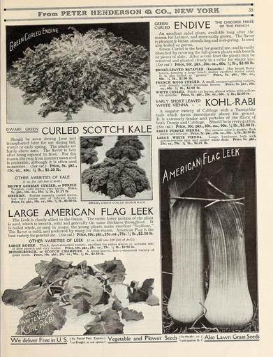 | Keywords: Everything for the garden (15770826773).jpg CO žp MEW Â¥ORE <br> 35 <br> DWARF GREEN <br> CURLED SCOTCH KALE <br> Should be sown during June and <br> transplanted later for use during fall <br> winter or early spring The plants are <br> hardy above zero The flavor is best <br> after being exposed to frost For this <br> reason the crop from summer sown seed <br> is preferable although it is often used <br> in summer See cut Price 5c pkt <br> 15c oz 40c lb 1 20 lb <br> OTHER VARIETIES OF KALE <br> 1 oz for 150 feet of drill <br> BROWN GERMAN CURLED or PURPLE <br> Purplish curly leaves; very hardy Price <br> 5c pkt 10c oz 35c H lb 1-25 lb <br> SIBERIAN Rather coarsely curled leaves <br> but very tender and of delicate flavor <br> Price 5c pkt 10c oz 30c M lb 1-00 lb <br> gss endive t e <br> An excellent salad plant available long after the <br> season for Lettuce and more easily grown _ The flavor <br> is pleasantly bitter stimulating and zest-giving is used <br> also boiled as greens <br> Green Curled is the best for general use and is easily <br> blanched by covering the full-grown plants with boards <br> or pieces of slate After severe frost the plants may be <br> removed and planted closely in a cellar for winter use <br> See cut Price 10c pkt 20c oz 60c H lb 2 00 b <br> BROAD-LEAVED BATAVIAN Escarolle Has broad fleshy <br> leaves forming a large heart; makes excellent winter salad <br> It is also boiled as greens Price 5c pkt 20c oz <br> 60c H lb 2 00 lb <br> FRENCH MOSS CURLED A small coinpact growmg variety <br> with densely curled moss-like leaves Price 5c pkt 20c <br> oz 60c M lb 2 00 lb <br> WHITE CURLED Finely cut leaves almost white with yellow- <br> ish midribs Price 5c pkt 20c oz 60c U lb- 2-00 lb <br> EARLY SHORT LEAVED <br> WHITE VIENNA <br> A singular variety of Cabbage with a Turnip-like <br> bulb which forms immediately above the ground <br> It is extremely tender and partakes of the flavor ot <br> both Turnip and Cabbage Should be in i every garden <br> See cut Price 10c pkt 30c oz 90c lb 3 00 lb <br> EARLY PURPLE VIENNA The outside color ifpurple; flesh <br> white and delicate Price 5c pkt 25c oz 75c h lb 2 50 lb <br> LARGE WHITE VIENNA Large handsome bulb with <br> greenish-white skin and tender white flesh Price 5c put <br> 25c oz 70c lb 2 25 lb <br> KOHL-RABI <br> DWARF GREEN CURLED SCOTCH KALE <br> LARGE AMERICAN FLAG LEEK <br> The Leek is closely allied to the Onion The entire lower portion of the plant <br> is used which is smooth solid and generally the same thickness throughout It <br> is boiled whole or used in soups; the young plants make excellent callions <br> The flavor is mild and preferred by many for this reason American i lag is the <br> best variety for general use See cut Price 10c pkt 25c oz 75c lb 2 50 lb <br> OTHER VARIETIES OF LEEK U oz will sow wo feel of drill <br> LARGE ROUEN Thick short-stemmed variety excellent for either winter or autumn use; <br> of slow growth and very tender Price 10c pkt 25c oz 75c lb 2 50 lb <br> MUSSELBURGH or SCOTCH CHAMPION A broad-leaved heavy-stemmed variety ot <br> great merit Price 10c pkt 25c oz 75c U lb 2 50 lb <br> a - ” / ' <br> We deliver Free in U S £ £J53 Vegetable and Flower Seeds £ Also Lawn Grass Seeds 43874827 149634 78295 Page 35 Text http //www biodiversitylibrary org/page/43874827 c1915 10 5962/bhl title 78295 Henry G Gilbert Nursery and Seed Trade Catalog Collection ; Peter Henderson Co Biodiversity Heritage Library Everything for the garden 1915 Garden Stories Books Bulbs Plants Catalogs Equipment and supplies Flowers Gardening Lawn mowers Seeds U S Department of Agriculture National Agricultural Library bhl page 43874827 dc identifier http //biodiversitylibrary org/page/43874827 bhlGardenStories BHLinbloom bulbs plants u s department of agriculture national agricultural library bhlgardenstories bhlinbloom Information field Flickr posted date ISOdate 2015-01-28 Check categories 2015 August 25 CC-BY-2 0 BioDivLibrary https //flickr com/photos/61021753 N02/15770826773 2015-08-25 03 02 03 cc-by-2 0 PD-old-70-1923 Everything for the garden 1915 Photos uploaded from Flickr by Fæ using a script |