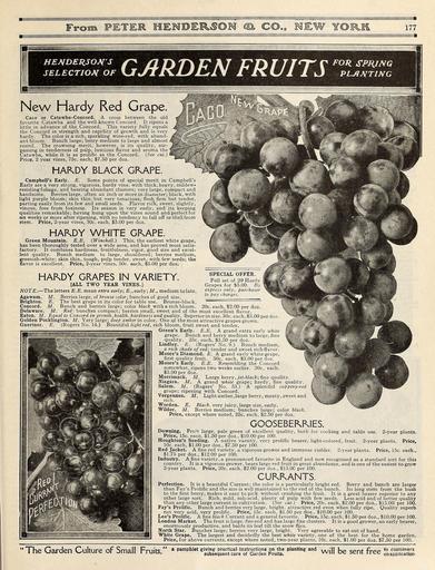 | Keywords: Everything for the garden (15771116563).jpg HEMDERSOW'S <br> SELECTION OF <br> GARDEN FRUITS IS <br> \ <br> i <br> New Hardy Red Grape <br> Caco or Catawba-Concord A cross between the old <br> favorite Catawba and the well-known Concord It ripens a <br> little in advance of the Concord This variety fully equals 4 <br> the Concord in strength and rapidity of growth and is very <br> hardy The color is a rich sparkling wine-red with abund- J <br> ant bloom Bunch large; berry medium to large and almost 4 <br> round The crowning merit however is its quality sur- M <br> passing in tenderness of pulp luscious flavor and aroma the Ź <br> Catawba while it is as prolific as the Concord See cut <br> Price 2 year vines 75c each; 7 50 per doz ' <br> HARDY BLACK GRAPE <br> Campbell's Early E Some points of special merit in Campbell's <br> Early are a very strong vigorous hardy vine with thick heavy mildew- <br> resisting foliage and bearing abundant clusters; very large compact and <br> handsome Berries large often an inch or more in diameter; black with <br> light purple bloom; skin thin but very tenacious; flesh firm but tender <br> parting easily from its few and small seeds Flavor rich sweet slightly <br> vinous free from foxiness Its season is very early and its keeping <br> qualities remarkable; having hung upon the vines sound and perfect for <br> six weeks or more after ripening with no tendency to fall off or shell from <br> stem Price 2-year vines 30c each 3 00 per doz <br> HARDY WHITE GRAPE <br> Green Mountain E E Winchell This the earliest white grape <br> has been thoroughly tested over a wide area and has proved most satis- <br> factory It combines hardiness fruitfulness vigot good size and excel- <br> lent quality Bunch medium to large shouldered; berries medium <br> greenish- white; skin thin tough pulp tender sweet with few seeds; the <br> flavor is excellent Price 2-year vines 50c each 5 00 per doz <br> SPECIAL OFFER <br> Full set of 20 Hardy <br> Grapes for 5 00 <br> express only purchaser <br> to pay charges <br> HARDY GRAPES IN VARIETY <br> ALL TWO YEAR VINES <br> NOTE The letters E E mean extra early; E early; M medium to late <br> Agawam M Berries large of bronze color; bunches of good size <br> Brighton E The best grape in its color for table use Bronze-black ~ ~ ~ <br> Concord M Bunch and berries large; color black with a rich bloom 20c each 2 00 per doz <br> Delaware M Red bunches compact; berries small sweet and of the most excellent flavor <br> Eaton M Equal to Concord in growth health hardiness and quality Superior in size 30c each 3 00 per doz <br> Golden Pocklington M Very large; deep amber in color One of the most attractive grapes grown <br> Gaertner E Rogers No 14 Beautiful light red rich bloom fruit sweet and tender <br> Green's Early E E A grand extra early white <br> grape Bunch and berry medium to large fine <br> quality 35c each 3 50 per doz <br> Lindley E Rogers' No 9 Bunch medium <br> a rich shade of red; tender and sweet rich flavor <br> Moore's Diamond E A grand early white grape <br> first quality fruit 30c each 3 00 per doz <br> Moore's Early E E Resembling the Concord <br> somewhat ripens two weeks earlier 30c each <br> 3 00 per doz <br> Merrimack M Large berry jet-black; fine quality <br> Niagara M A grand white grape; hardy fine quality <br> Salem M Rogers' No 53 A splendid coppery-red <br> grape; ripening with Concord <br> Vergennes M Light amber large berry meaty sweet and <br> rich <br> Worden E Black very juicy large size early <br> Wilder M Berries medium; bunches large; color black <br> Price except where noted 25c each 2 50 per doz <br> GOOSEBERRIES <br> Downing FruH large pale green of excellent quality both for cooking and table use 2-year plants <br> Price 15c each 1 50 per doz 10 00 per 100 <br> Houghton's Seeding A native variety very prolific bearer light-colored fruit 2-year plants Price <br> 10c each 1 00 per doz 7 50 per 100 <br> Red Jacket A fine red variety a vigorous grower and immense yielder 2-year plants Price 15c each <br> 1 75 per doz 12 00 per 100 <br> Industry A fine variety a pronounced favorite in England and now recognized as a standard sort for this <br> country It is a vigorous grower bears large red fruit in great abundance and is one of the easiest to grow <br> 2-year plants Price 20c each 2 00 per doz 15 00 per 100 <br> CURRANTS <br> Perfection It is a beautiful Currant; the color is a particularly bright red Berry and bunch are larger <br> than Fay's Prolific and the size is well maintained to the end of the bunch Its long stem from the bush <br> to the first berry makes it easy to pick without crushing the fruit It is a great bearer superior to any <br> other large sort Rich mild sub-acid plenty of pulp with few seeds Less acid and of better quality <br> than any other large currant in cultivation See cut Price 20c each 2 00 per doz 15 00 per 100 <br> Fay's Prolific ' Bunch and berries very large bright attractive red even when fully ripe Quality superb <br> not very acid very prolific Price 15c each 1 50 per doz 10 00 per 100 <br> Lee's Prolific A fine black Currant and a general favorite Price 15c each 1 50 per doz 10 00 per 100 <br> London Market The fruit is large fire-red and has large fine clusters It is a good grower an early bearer <br> enormously productive and holds its leaf till the snow flies <br> North Star Bunches large; berries very large bright Very agreeable to eat out of hand <br> White Grape The largest and decidedly the best white variety one of the best for the home garden <br> Price for above currants except where noted two-year plants 10c each 1 00 per doz 7 50 per 100 <br> The Garden Culture of Small Fruits/ <br> a pamphlet giving practical instructions on the planting and ' U p _- n Crop to customers <br> subsequent care of Garden Fruits will uc 5CUI 1 1 tec; onapplication 43874969 149634 78295 Page 177 Text http //www biodiversitylibrary org/page/43874969 c1915 10 5962/bhl title 7