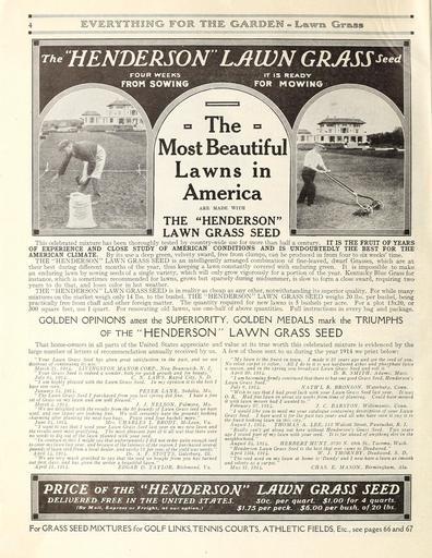 | Keywords: Everything for the garden (16203149808).jpg of your Lawn <br> Grass Seed I have used it for the past two years and all who have seen it say it is <br> the finest looking lawn in this city <br> August 1 1914 THOMAS A LEE 112 Walcott Street Pawtucket R I <br> Really can't get along out here without Henderson's Grass Seed Two years <br> ago I sowed part of my lawn with your seed It is far ahead of anything else in the <br> neighborhood <br> August 24 1914 HERBERT HUNT 3730 N 28th St Tacoma Wash <br> Henderson Lawn Grass Seed is the best that ever came to Deadwood <br> April loth 1914 W J THORNBY Deadwood S D <br> The seed used on my lawn at home is 'Dandy' and I now have a lawn as smooth <br> and velvety as a carpet <br> May 31 1914 CHAS E MASON Birmingham Ala <br> PRICE of the HENDERSON LAWN GRASS SEED <br> DELIVERED FREE IN THE UNITED STATES SOc per quart 1 OO for 4 quarts <br> By Mail Express or freight at our option _-- – t 7S per ' peck 6 00 per busfl Of 20 lbs <br> For GRASS SEED MIXTURES for GOLF LINKSTENNIS COURTS ATHLETIC FIELDS Etc see pages 66 and 67 43874796 149634 78295 Page 4 Text http //www biodiversitylibrary org/page/43874796 c1915 10 5962/bhl title 78295 Henry G Gilbert Nursery and Seed Trade Catalog Collection ; Peter Henderson Co Biodiversity Heritage Library Everything for the garden 1915 Garden Stories Books Bulbs Plants Catalogs Equipment and supplies Flowers Gardening Lawn mowers Seeds U S Department of Agriculture National Agricultural Library bhl page 43874796 dc identifier http //biodiversitylibrary org/page/43874796 bhlGardenStories BHLinbloom bulbs plants u s department of agriculture national agricultural library bhlgardenstories bhlinbloom Information field Flickr posted date ISOdate 2015-01-28 Check categories 2015 August 25 CC-BY-2 0 BioDivLibrary https //flickr com/photos/61021753 N02/16203149808 2015-08-25 03 51 22 cc-by-2 0 PD-old-70-1923 Everything for the garden 1915 Photos uploaded from Flickr by Fæ using a script |
