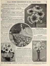 | Keywords: Everything for the garden (16203315608).jpg  Ff DKim FETEIR HEMDEIRSOM EL CO MEW Â¥OM <br> 93 <br> EUPHORBIA MARGINATA or Snow-on-the-Mountain <br> This native annual is quite popular as a garden plant on account of its showy appearance <br> and ease of culture in almost any soil ” even the poorest ” if in a sunny location It is of <br> rank branching growth about 2 feet high The foliage of light green being broadly <br> margined with silvery-white giving the effect ” -in miniature ” of Snow-on-the- <br> Mountain Pkt 10c <br> GAILLAKDIA ANNUAL VARIETIES <br> Very showy garden annuals 1 to 2 feet high Grown in masses they are es- <br> pecially effective; large flowers 2 to 3 inches across produced from early summer <br> until frost; unrivaled for cutting <br> Mixed Single Varieties Pkt 5c <br> Lorenziana or Double-flowering Large round heads composed of numerous <br> flowers of crimson garnet lemon orange etc in miniature Pkt 5c <br> GIANT HARDY HYBRID GAILLARDIA <br> The flowers are often 4 to 5 inches across colored in great diversity of variations <br> and blendings including such combinations as scarlet with gold edge blood-red <br> with yellow edge yellow with orange disk golden with scarlet border pure yellow <br> fiery-crimson and many others These are hardy perennials compact in growth <br> and produce a succession of flowers summer and fall As cut flowers last in <br> water for days See cut <br> Giant Hardy Hybrid Mixed Colors Pkt 10c <br> Grandiflora Sibylla Novelty Very large bright carmine-red flowers the <br> petals of which are narrowly tipped or pointed with light yellow Very <br> free-blooming and strikingly effective Pkt 25c <br> GERANIUM GIANT FLOWERING HYBRID <br> The flowers are extra large round of the most perfect form borne in splendid <br> trusses some of them forming balls 16 inches in circumference The colors include <br> shades of scarlet and crimson rose pink salmon cream veined pink blush snowy- <br> white and all of the new auriole types These all stand the hot sun and although <br> perennials they will produce nice bushy plants and <br> flower from seeds sown the same season; 12 to 18 <br> Inches high See cut <br> Giant-flowering Hybrids Mixed Colors <br> Pkt 15c <br> Double Giant-flowering Mixed Col- <br> ors Pkt 25c <br> Ivy-leaved Single Large-flower- <br> ing Mixed Colors Pkt 25c <br> GLOBE AMARANTH <br> Bushy plants about 2 feet <br> high The flowers are useful <br> for dried winter bouquets If <br> cut before they are fully ripe <br> and allowed to dry in a <br> dark airy room they will <br> retain their color the whole <br> season <br> Mixed Purple white <br> etc Pkt 5c <br> NANA Compacta Mixed <br> 4 foot high Pkt 5c <br> GLOXINIA <br> Charming summer- <br> blooming pot plants for <br> conservatory green-house <br> or window garden They <br> flower in great profusion <br> having gorgeous colors <br> many of which are magnifi- <br> cently spotted and mottled <br> 1 foot See cut <br> Large-flowering Mixed Pfei 25c <br> GNAPHALIUM <br> -OR SIBEKIAN EDELWEISS <br> This beautiful Everlasting is a hardy perennial <br> growing about one foot in height being larger <br> than the famous Alpine Edelweiss the star- <br> shaped woolly white flowers being fully as <br> large again It also thrives better under culti- <br> vation and in low latitudes than the Alpine <br> type Especially suited for rock gardens and <br> hillsides Pkt 15c <br> FUCHSIA <br> Single and Double Mixed Tender perennial <br> plants 2 to 4 feet high with pendent flowers <br> of red white purple etc Seed sown early in <br> the house will produce flowering plants the first <br> season; fine for pot culture or bedded out in <br> partial shade during summer Pkt 25c <br> GERBERA OR transvaal daisy <br> A beautiful race of flowering plants brought into <br> prominence recently with the introduction of an improved <br> large-flowering scarlet type and the new various-colored <br> hybrids They are half hardy perennials usually grown <br> as greenhouse or window plants where they flower <br> continuously The Daisy-like blossoms 3 to 4 inches <br> across being borne on 12 to 18 inch stems are unsur- <br> passed as cut flowers being of splendid lasting substance <br> For garden culture in cold climates the plants are <br> wintered over in cold frames like Pansies etc They are <br> easily grown from seed and will commence flowering the <br> first year though older plants will produce the greater <br> abundance of bloom See cut <br> Giant Scarlet Gerbera Immense flowers 5 to 6 inches <br> across on 2 to 3-foot stems Color intense scarlet Pkt 2 5c <br> Adnet's New Hybrids A French strain that has <br> created a furore in the European floral world The <br> colors include a galaxy of incomparable delicacy and <br> richness in which an infinity of tints from pure white <br> through yellow orange salmon rose cerise and ruby- <br> red to violet are represented Sometimes the color- <br> ing of the disk differs from that of the rays Pkt 35c <br> Popular <br> Edition <br> PICTURESQUE GARDENS by Charles Henderson J £ 2 tf V B'g£ –  <br> A B FARQUHAR York Pa <br> t 1 00 postpaid <br> «P1 See page 199 43874885 149634 78295 Page 93 Text http //www biodiversitylibrary org/page/43874885 c1915 10 5962/bhl title 78295 Henry G Gilbert Nursery and Seed Trade Catalog Collection ; Peter Henderson Co NameFound Compacta NameConfirmed Compacta EOLID 10934908 NameBankID 2627020 NameFound Euphorbia marginata NameConfirmed Euphorbia marginata EOLID 1144444 NameBankID 2651828 NameFound Gaillardia NameConfirmed Gaillardia Foug EOLID 38325 NameFound Gerbera NameConfirmed Gerbera EOLID 60453 NameBankID 2676014 NameFound Gloxinia NameConfirmed Gloxinia L'Her EOLID 72184 NameFound Gnaphalium NameConfirmed Gnaphalium EOLID 59452 NameBankID 2658074 NameFound Grandiflora NameFound Lorenziana NameConfirmed Lorenziana NameBankID 5328378 NameFound Sibylla NameConfirmed Sibylla EOLID 10138 NameBankID 4342936 Biodive
