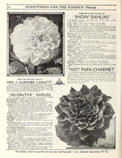 | Keywords: Everything for the garden (16203468618).jpg 158 <br> EVERYTHING FOR THE GARBEM Plants <br> NEW DECORATIVE DAHLIA <br> MRS J GARDNER CASSATT <br> An exquisite new Dahlia that because of its fine color and elegant <br> form may well be considered one of the best of its type The flowers <br> are large and of a very pleasing shade of mauve-pink A strong <br> grower it produces an abundance of bloom on stout stems well <br> above the foliage A valuable addition to any collection See cut <br> Price field grown roots 50c each S5 00 per doz <br> DECORATIVE DAHLIAS <br> The Decorative Dahlias have very large gracefully formed <br> flowers with broad petals Invaluable for cut-flowers <br> Baron Schroeder This is a rich glowing crimson-purple <br> Black Beauty A grand dark maroon of distinct form <br> Catherine Duer A very bright iridescent scarlet-crimson poss- <br> ibly the best in its color Large flowers on strong stem <br> Cleopatra The finest dark colored variety yet introduced Large <br> perfectly formed flower never showing the center broad petals <br> The color is very rich shade of velvety crimson-maroon not dull <br> but very much alive ; a new color in Decorative Dahlias The plant is <br> of strong growth spreading habit and is very free flowering <br> Awarded a certificate of merit in New York Price 35c each <br> 3 50 per doz Field grown roots <br> Eureka Deep rose a grand color fine regular form quilled <br> petals and full to the center Deep well formed flowers <br> Fire Rain A dazzling shade of cardinal red; very free <br> Henry Patrick A pure white large flowers on long stems <br> John Elitch Deep rich red a magnificent flower <br> I yndhurst Intensely rich and vivid scarlet Fine for cut <br> flowers <br> Mme Van Den Dael The coloring is exquisite a soft shell-pink <br> with deep pink shadings toward the margins; the center being <br> lighter in shade The petals are broad the whole flower being <br> graceful in the extreme <br> Miss Minnie McCullough Soft yellow over-laid with bronze <br> very handsome under artificial light Fine for cutting <br> Mrs Hartong Rich golden bronze; distinct and beautiful <br> Orange King Very rich glowing orange-scarlet <br> Perle de Lyon Not only the most valuable white Decorative Dahlia <br> but the best white of any class for cut flower purposes; its <br> flowers are of good size and held erect on long stiff wiry stems <br> Grand for cut flowers <br> Sylvia White shading to soft pink on the outer petals Splen- <br> did substance giving it an unsurpassed keeping quality <br> Wm Agnew The grandest red Cactus Dahlia large and fine <br> Invaluable for its magnificent flowers <br> Yellow le Colosse A grand Decorative Dahlia splendid for <br> exhibition Color a very bright yellow flowers exceptionally <br> large perfect form with full high center <br> Price field-grown roots except where noted 20c each 2 00 <br> per doz ; set of 17 Decorative Dahlias above for 3 00 <br> IMPROVED LARGE DOUBLE OR <br> SHOW DAHLIAS <br> A D Livoni Beautiful soft lustrous pink Grand flowers A fine <br> variety for cut flowers <br> Chas Lanier Deep yellowish amber buff shadings <br> Client Deep velvety maroon Flowers large and full <br> Dorothy Peacock A beautiful soft pink shading slightly darker on the <br> outer petals as the flower expands Strong vigorous grower without <br> any indication of weakness or disease each plant being sturdy and <br> vigorous The leaves are very heavy with great texture and glossy <br> finish withstanding all kinds of adverse conditions <br> Electric Soft rosy magenta large flower Very striking <br> Ethel Maule Pure white slightly tinged pale lavender in the center <br> Grand Duke Alexis Color pure soft white the tips of the petals <br> edged and suffused with delicate pink The finest of the type <br> A general favorite <br> Gloire de Lyon Pure white fine large flower <br> John Walker A beautiful pure white variety; form round and full <br> with high center <br> Magnificent Dwarf large pure yellow A fine bedder <br> Orlando Buff-salmon shaded rose and amber <br> Queen of Yellows A beautiful profuse clear yellow <br> Storm King A grand snow white Dahlia blooms early and constantly <br> long stems fine for cut flowers <br> Souv de Mme Moreau Deep pink splendid form <br> Susan Probably no Dahlia recently introduced has given such uni- <br> versal satisfaction as this It is a beautiful delicate soft shell-pink of <br> splendid form remarkably early and free flowering with long stems <br> splendid for cutting <br> Triomphe de Solferino Deep solferino Large and full <br> Wm Pierce A delicate tint of shell pink Very attractive <br> Price field-grown roots 20c each 2 00 per doz set of 17 sorts for <br> 53 00 <br> dec dSE a lX ve papa charmet <br> A wonderfully rich shade of coral-red overlaid with a darker shade of <br> velvety maroon The flowers are of good size under normal conditions <br> and by disbudding flowers six inches or over across may be had The <br> habit is ideal compact medium height and branching The demand <br> for_Dahlias as cut flowers is constantly increasing and this fine variety <br> is unsurpassed for that purpose See cut Price field-grown roots <br> 35c each; 3 50 per doz <br> c ' ' <br> The Dahlias which we got from you last year were beautiful J C Gallandet Quinnimont W Va 43874950 149634 78295 Page 158 Text http //www biodiversitylibrary org/page/43874950 c1915 10 5962/bhl title 78295 Henry G Gilbert Nursery and Seed Trade Catalog Collection ; Peter Henderson Co NameFound I yndhurst Biodiversity Heritage Library Everything for the garden 1915 Garden Stories Books Bulbs Plants Catalogs Equipment and supplies Flowers Gardening Lawn mowers Seeds U S Department of Agriculture National Agricultural Library bhl page 43874950 dc identifier http //biodiversitylibrary org/page/43874950 bhlGardenStories BHLinbloom bulbs plants u s department of agriculture national agricultural library bhlgardenstories bhlinbloom Information 