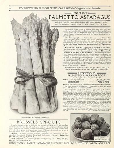 | Keywords: Everything for the garden (16204568769).jpg 10 <br> EVESnrmiMG FOR TIE GAIRDEM - V rf talbl Seeds <br> HENDERSON'S <br> PALMETTO ASPARAGUS <br> LAFkGER EARLIER MORE UNIFORM IN SIZE MORE PROLIFIC AND <br> DISEASE-RESISTING THAN ANY OTHEK ASPARAGUS GROWN <br> Asparagus grows easily in almost any good soil but best <br> results are obtained in well-enriched deeply dug sandy loam <br> A well cared for bed improves with age and lasts for many <br> years It may be grown from seed but much time is saved by <br> planting roots <br> The Asparagus plant is slow to die down in the fall so that <br> the roots cannot safely be dug until about November 1st By <br> this time the soil is so cool that the plants do not rcot readily <br> consequently many are winter killed For this reason we <br> advise only spring planting for any point north of Washington <br> D C <br> Henderson's Palmetto Asparagus is superior to all others <br> We have grown and thoroughly tested every known variety of <br> Asparagus but ” in the American climate at least ” Henderson's <br> Palmetto is the king of all Asparagus It is superior in every <br> way larger earlier quicker in growth more continuous in <br> bearing and more uniform in size The stalks average about <br> an inch in diameter the usual bunch of 15 shoots is \V/v inches <br> in circumference and weighs about 2 pounds It is delicious <br> in flavor extremely tender and equally well adapted to all <br> sections of the country It is also less susceptible to disease <br> having yielded abundant crops where all other varieties have <br> entirely succumbed See cut <br> Henderson's Palmetto Asparagus Seed 10c pkt 15c oz 30c 34 lb <br> 80c lb A saving of one to two years is effected by planting roots <br> HENDERSON'S <br> PALMETTO ASPARAGUS ROOTS <br> Can be supplied from Nov 1st to May 1st <br> PRICES buyer paying transit Per 100 i Per 1 00 <br> Two-year-old roots 1 50 10 00 <br> Three-year-old roots 2 00 I 16 00 <br> Colossal 2-yr -old roots buyer paying transit 1 00 per 100; 6 00 per 1 000 <br> For Parcel Post Zone rates see page 1 100 2-year old roots will weigh <br> 5 lbs 100 3-year old roots will weigh 10 lbs <br> I wish to lake this opportunity to express my appreciation of the results ob- <br> tained from Henderson's Palmetto Asparagus The first roots from you are <br> – now being cut for the second season and 1 can say that 1 have received the <br> largest and finest in this whole section as can be attested by one of our foremost <br> hucksters in this market J A Slaughter Most all stalks cut weigh from 3 <br> to 6 oz each and I must say that the strain is better than you claim J hope <br> to be able to go in for quite a good field in the next few years and J am gradually <br> adding each year You will find enclosed a photo of a stalk cut May 23d How <br> much larger do they growl REGINALD KEITH Richmond Va <br> I am adding to my Asparagus bed an extension of 10 x 15 Will you kindly <br> send me the necessary number of roots for this of your best variety and as old <br> as will properly bear transplanting I bought roots from you six years ago <br> and set them out in accordance with your directions and the bed has borne <br> steadily and increasingly ever since W F WOODW ARD Portland Ore <br> I bought fifty 3-year old Palmetto Asparagus roots and they have given such <br> great satisfaction that my friend Mr Oldfield asks me to send for fifty <br> for him W T BROWN Muskogee Okla <br> HENDERSON'S PALMETTO ASPARAGUS <br> BRUSSELS SPROUTS <br> Brussels Sprouts sown in June in the latitude of New York will produce <br> an abundant crop in the fall and early winter It rarely succeeds as a spring <br> crop It is hardier than Cabbage just as easily grown and may be used long <br> after all other green vegetables are gone Cultural directions are given in <br> Cabbage leaflet sent free if asked for when ordering <br> Dalkeith A -very excellent selection producing <br> succulent Sprouts of delicious flavor and tenderness <br> pkt 30c oz 90c 14 lb 3 00 lb <br> Dwarf Improved An extremely hardy dwarf growing sort <br> an abundance of solid <br> See cut Price 10c <br> 25c oz 75c \i lb 2 50 lb <br> Price 10c pkt <br> DALKEITH <br> BRUSSELS SPPnOUTS <br> HENDERSON'S LEAFLET ASPARAGUS CULTURE FREE TO CUSTOMERS WHEN ASKED FOR 43874802 149634 78295 Page 10 Text http //www biodiversitylibrary org/page/43874802 c1915 10 5962/bhl title 78295 Henry G Gilbert Nursery and Seed Trade Catalog Collection ; Peter Henderson Co NameFound Asparagus NameConfirmed Asparagus var pygmaeus Makino EOLID 10487111 NameFound Palmetto asparagus Biodiversity Heritage Library Everything for the garden 1915 Garden Stories Books Bulbs Plants Catalogs Equipment and supplies Flowers Gardening Lawn mowers Seeds U S Department of Agriculture National Agricultural Library bhl page 43874802 dc identifier http //biodiversitylibrary org/page/43874802 bhlGardenStories BHLinbloom bulbs plants u s department of agriculture national agricultural library bhlgardenstories bhlinbloom Information field Flickr posted date ISOdate 2015-01-28 Check categories 2015 August 25 CC-BY-2 0 BioDivLibrary https //flickr com/photos/61021753 N02/16204568769 2015-08-25 03 03 00 cc-by-2 0 PD-old-70-1923 Everything for the garden 1915 Photos uploaded from Flickr by Fæ using a script |