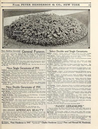 | Keywords: Everything for the garden (16205204057).jpg New Bedding Ger anium Q enera FuflStOn <br> A beautiful semi-double sport of the well known bedding Geranium <br> Double Gen Grant In general habit and foliage it resembles the <br> parent variety The color is a deep salmon throughout the flower and <br> a shade that does not conflict with any of the salmon varieties now on the <br> market In our grounds the past season it has proved itself one of the best <br> bedding varieties we have ever grown flowering freely and continuously from <br> early in the season until frost <br> The cut above shows a bed of this variety edged with Alternanthera Jewell <br> see page 173 planted by us in the Convention Garden at Boston Mass <br> last year which received Honorable Mention <br> Price 25c each 2 50 per doz 12 00 per 100 Not less than 50 sold at <br> the 100 rate <br> New Single Geraniums of 1914 <br> Antithese Large round flowers of a vermilion scarlet color with a large spot on <br> upper petals; great contrast of color robust very floriferous <br> Charles Guerin This is a very fine variety with large trusses Flowers are a <br> beautiful salmon-carmine with white eye A very attractive variety <br> Count Zeppelin Plant is robust has good habit Color is intense fiery red <br> Long straight flower stalks support the large trusses high above the foliage <br> Jean Pabon Robust and free flowering enormous trusses held well above the <br> foliage grand round flowers The color is blood red with small white eye <br> Jean Rose The color is rosy-carmine upper petals maculated white The <br> plant is a strong compact grower flower stems long <br> Secretaire Barat Beautiful flowers of fine form; carmine lake shaded bright <br> salmon A constant bloomer standing our extreme climatic conditions <br> in excellent shape <br> New Double Geraniums of 1914 <br> Albert de Lapparent Immense aurora rose flowers Has large white eye <br> One of the best varieties yet introduced of its class and color <br> Helen Michell A splendid bedding variety a profuse bloomer and above <br> all remarkable for the size and brilliancy of the flowers which are of the <br> clearest possible shade of scarlet <br> Joachim du Beallay Plant of good habit very free flowering A beautiful <br> shade of rosy-white large semi-double flowers <br> M C Poinsot Semi-double flowers clear carmine-like color with white eye <br> Flowers very freely <br> Mme Paola Radaelli The trusses are large and beautifully formed Bloom <br> freely all summer Color creamy white Growth sturdy and compact <br> Scarlet Bedder In color it is intermediate between S A Nutt and Alphonse <br> Ricard being brighter or approaching nearer to scarlet than either of the <br> above varieties Growth sturdy similar to that of Alphonse Ricard A <br> distinct and valuable bedding Geranium <br> Price for the above Single and Double 25c each 2 50 per doz <br> Collection of 12 New Single and Double Geraniums for 1914 2 50 <br> new geranium AMERICAN BEAUTY <br> This variety was named American Beauty by the introducer because the <br> color is almost identically the color of the popular rose of that name The <br> beautiful semi-double flowers are deep rosy-carmine shaded with carmine- <br> crimson They are not effected by extremes of weather The habit is perfect; <br> semi-dwarf branching and compact; the trusses are produced on long stems <br> held well above the foliage A free and continuous bloomer either in pots <br> or for bedding <br> Price 25c each 2 50 per doz <br> Select Double and Single Geraniums <br> Agathos Double Strong trusses; semi-double flowers of a deep carmine <br> color A compact well branched plant A distinct and charming variety <br> Claire Frenot Single Plants robust and of good habit; excellent trusses; <br> nymphea rose color shading daybreak veined rose salmon <br> Clarus Beautiful semi-double flowers of a most tempting fresh shade of silver <br> rose; very effective for a border <br> Comtesse de Hohenwaft Single Currant red with cardinal red upper <br> petals - shading lighter toward center very large trusses A perfect mass <br> of bloom the entire season <br> Dr Wiley Double A seedling of L'Aube crossed with Jean Oberle The <br> color is darker pink than Jean Oberle Small foliage Habit of growth <br> ideal <br> G Zille Double Good trusses and large flowers of a pretty shade of coch- <br> ineal carmine shading through violet at center to beautiful and rich color <br> good habit <br> Jacques Daurelle Single A well bred low growing and floriferous variety <br> Strong trusses of bright cochineal red flowers Unsurpassed in its color as <br> a pot plant <br> Jean Balde Single A beautiful novelty shade of reddish purple; petals <br> are blotched white at base very floriferous enormous trusses The florets <br> are especially well formed <br> Jean Eyriam Double Free flowering large trusses semi-double flowers <br> of a carmine lake color with large white eye Growth strong and robust <br> Jeanne Gazin Double Plant robust and massive; enormous trusses sup- <br> ported on long stems lasting exceptionally long; clear beautiful rose colored <br> flowers Its strong healthy constitution enables it to withstand the extreme <br> heat <br> Jean Rostand Single Handsome flowers of a brilliant Vermillion red with <br> a large white center reticulated blue veins semi-dwarf and compact habit <br> fine foliage <br> Latham Double Immense semi-double flowers of a beautiful shade of a <br> deep madder carmine with a white center very floriferous; a distinct variety <br> enormous trusses long flower stalks <br> Leonce Depont Single Deep carmine shading purple with a large white <br> center beautiful flowers good strong trusses Being a profuse bloomer it <br> is unexcelled as a pot plant or for bedding <br> Raymond Poincare Single Immense flowers of a deep carmine color; <br> upper petals blotched white Great contrast of color <br> Regalis Double Immense semi-double flowers and trusse