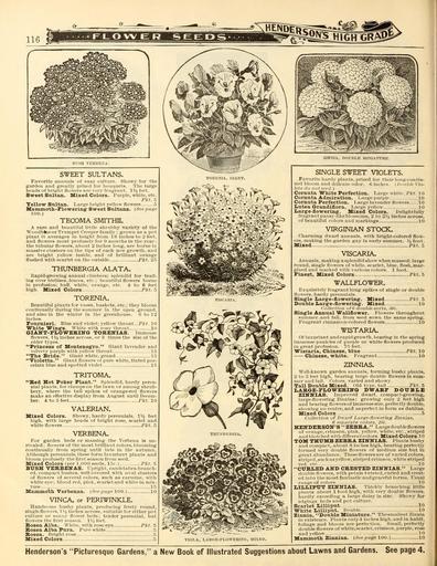 Keywords: Everything for the garden (16231841854).jpg 116 <br> BUsa VERBENA <br> SWEET SULTANS <br> 'Favorite annuals of easy culture Showy for the <br> garden and greatly prized for bouquets The large <br> heads of bright flowers are very frajrrant IVj feet <br> Sweet Sultan mixed Colors Purple white etc <br> Pkt 5 <br> Yellow Saltan Larce briclit yellow flowers t <br> Manunoth-Flowering' Sweet Saltans ˘SVc pane <br> 3 00 <br> TECOMA SMITHIL <br> A rare and beautiful little shrubby variety of the <br> – WoodbfcieorTrumpet Creeper family ; growu as a pot <br> plant it averages in height from 18 inches to 2 feet <br> and flowers most profusely for 9 months In the year; <br> the tubular flowers about 2 inches long are borne in <br> massive clusters on the tips of each new growth and <br> are bright yellow inside and of brilliant orange <br> flushed with scarlet on tlie outside Pkt 2 T <br> THUNBERGIA ALATA <br> Rapid-growing annual clinibei-s; splendid for trail- <br> ing over trellises fenics etc ; beautiful flowers borne <br> in profusion; buff white orange etc 4 to 6 feet <br> high Mixed Colors Pkt v <br> TORENIA <br> Beautiful plants for vases baskets etc ; they bloom <br> contlnuall v during the summer in the ojien ground <br> and also in the winter in the greenhouse 6 to 12 <br> inches <br> roamieri Blue nnd violet; yellow throat PAf 10 <br> White Wings White with rosv throat 10 <br> GIANT-FI OWEBISrO TOKEITIAS Immense <br> flowers 1 Va inches across or 3 times the size of the <br> older types <br> Princess of Uontenegro Giant lavender and <br> velvety purple with yellow throat 15 <br> The Bride tiiant white grand 15 <br> Violetta Giant flowers of pure white tinted por- <br> celain blue and spotted violet 15 <br> TRITOMA <br> Bed Hot Poker Plant Splendid hardy peren- <br> nial plants for cUiinpson the lawn or among shrub- <br> bery where the tall spikes of orange-red flowers <br> make an effective display from August until Decem- <br> ber 4 to 5 feet Pkt 10 <br> VALERIAN <br> Mixed Colors Showy hardy perennials 1 feet <br> high with large heads of bright rose scarlet and <br> white flowers Pkt 5 <br> VERBENA <br> For garden beds or massing the Verbena is un- <br> rivaled ; flowers of the most brilliant colors blooming <br> contlnuall v from spring until late in the autumn <br> Although perennials these form luxuriant plants and <br> bloom irofnsely the first season from seed <br> Mixed Colors er 1 000 seeds 1 5c Pkt 5 <br> BUSH VBBBBNAS Upright candelabra-branch- <br> ed con pact bushes well covered with oval clusters <br> of flowers of several colors such as carmine with <br> white eye; blood red pink scarletand white in mix- <br> ture 15 <br> Maiixmoth Verbenas See page 100 10 <br> VINCA Of PERIWINKLE <br> Handsome bushy plants producing freel v round <br> singleflowers IV2 inches across suitable for either pot <br> culture or sunny flower beds; tender perennial but <br> flowers the first season IV2 feet <br> Rosea Alba White with rose eye Pkt 5 <br> Rosea Alba Pura Pure white 5 <br> Rosea Bright rose 5 <br> Mixed Colors 5 <br> toi i;nia i;iant <br> THtlNBEHGIA <br> VIOLA LARGE-FLOWEBING MIXED <br> SINGLE SWEET VIOLETS <br> Favorite li jrd v plants prized for f hcij- long-rontin- <br> ued bloom and delicate odor G inches I/Diihle Vio- <br> let s do nuts – I'll <br> Comata White Perfection I nrge white PA 10 <br> Comata Admiration Large puri le 10 <br> Comuta Perfection Large lavender flowers 10 <br> laUtea Grandiflora Large yellow 10 <br> Laxgre-flowering- Mixed Colors Uelightfuily <br> fragi-ant piinsy-likeblcissonis 2 to 2'- ; inches across <br> of beautiful culors and markings 10 <br> VIRGINIAN STOCK <br> flmrming dwarf annuals with bright-colored flow- <br> rs making the garden gay In earlv summer V4 foot <br> Mixed Pkt 5 <br> VISCARIA <br> Annuals making a splendid show when massed; large <br> round siugle flowers of white scarlet blue flesh mar- <br> gined and marked with v -irious t'olors 1 foot <br> Finest Mixed Colors Pkt o <br> WALLFLOWER <br> Exquisitely fragrant long spikes of single or double <br> flowers liardy perennials <br> Single laargfe-fiowering Mixed Pkt 5 <br> Doable Large-flowering Mixed 10 <br> Ciilleitiiiii 11/ 1 iliiiible sort s Wv <br> Single Annual Wallflower Flowers throughout <br> summer and fall from seed sown the same spring <br> Fragrant ciunamon-colored flowers 10 <br> WISTAIUA <br> Of luxuriant and rapid growth bearing In the spring <br> immense panicles of jiurple or white flowers produced <br> in great i rofusion 75 feet <br> Wistaria Chinese blue Pkt 10 <br> Chinese white Fragrant 10 <br> ZINNIAS <br> – Well-known garden annuals forming bushy plants <br> 2 to 3 feet high liearing large double flowers In sum- <br> mer and fall Colors varied and showv <br> Tall Doable Mixed Old type tall Pkt 5 <br> I ARGE-FI OWERIII'a DWARF DOTTBLi <br> ZINITIAS Imi roved dwarf compact-growing <br> hirge-flowerlng Zinnias; growing only 2 feet high <br> and bearing flc wer8 of immense size perfectl y double <br> showing no centre and as perfect in form as dahlias <br> Mixed Colors 5 <br> Culk'ctiun of liwnrf L;irf e-t1o\vering Zinnias <br> sep 'tr ife roiors 2 ~tc <br> HBinJERSOK'S ZBBRA Largedoubleflowers <br> of orange crimson pink yellow white etc striped <br> andblotched with different colors Mixed Colors 1 <br> TOM THUMB ZBBRA ZINNIAS Plants bushy <br> and compact about 8 inches liigii bearing perfectly <br> formed ver v double flowers of medium size but In <br> great abundance These flowers are of varied colors <br> striped such asyellow striped crimson white striped <br> red etc 10 <br> CURLED AND CRESTED ZINNIAS Large <br> double flower s witli petals twisted curled and crest- <br> ed into the most fantastic and graceful forms Usual <br> range of colors 10 <br> IiILLIPUT ZINNIAS Thickly branching little <br> jilants about 1 foot high with very double flowers <br> hardl v exceeding a large daisy In size Showy for <br> edgings IhmIs and pot culture