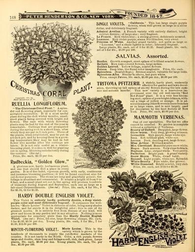 | Keywords: Everything for the garden (16231930174).jpg 168 <br> PETER HENDERSON fltCO NEW YORK- <br> SINGLE VIOLETS <br> California This has large single purple <br> flowers when well grown as large as a silver <br> dollar and deliciously fragrant <br> Admiral Avellan A French variety with entirely distinct bright <br> reddish flowers ; of large size ; very fragrant <br> La France Rich violet-blue ; a strong grower deliciously scented <br> Luxonne Rich violet-purple stems 9 to 12 inches very sweet <br> Princess of Wales Another grand variety not quite as large as <br> Luxonne and a shade lighter in color ; intensely fragrant <br> Large plants 30c each set of 5 for SI 25 Small plants 10c each <br> set of 5 for 40c S5 00 per 100 <br> SALVIAS Assorted <br> Bonfire Growth compact erect spikes of brilliant scarlet flowers <br> Bethelii Rich rose-colored flowers large spikes <br> Golden Leaved Yellow foliage scarlet flowers <br> Patens Deep blue tlie finest color imaginable Price 15c each <br> Splendens Scarlet Suge Intense scarlet valuable for large beds <br> Splendens Alba Similar to above but pure white <br> Price except Patens 10c each 1 00 per doz 6 00 per 100 <br> TRITOMA PFITZERII i ž <br> j mowM <br> Copyright I'MI by t~~- - – – - t <br> Peter Henderson d- Co illl \L---- iL;;i ;;; '-'T3 <br> RUELLIA LONGIFLORUM <br> The Christmas Coral Plant A splen- <br> did red flowering plant especially for con- <br> servatory decoration It is a most useful <br> plant during the dull winter months small- <br> sized plants being covered with bright red <br> flowers The ease with which flowering <br> plants may be had by the end of the year is <br> remarkable Cuttings that are propagated <br> during the spring root in a short time after <br> which they are put in 3-inch pots Three of <br> the plants when established may be put in <br> a 6-inch pot and by keeping them in a grow- <br> ing temperature they may be had in full <br> flower two months after the cuttings are <br> taken It is not only useful as a winter- <br> blooming plant it comes in well for planting <br> out in spring blooming satisfactorily during <br> the summer See cut <br> Price 25c each 2 25 per doz <br> » <br> J udBeci l/r- <br> Rudbeckia Golden Glow <br> A glorious new hardy herbaceous plant <br> and one that should find a place in every <br> garden It is of fine habit vigorous growth with early continuous <br> and immense blooming qualities ; it will be found excellent also for <br> cut-flower purposes The stems are long and gracefully poised ; the <br> foliage is abundant and ornamental It attains a height of from 6 to <br> 8 feet and a small plant set out in the spring will produce hundreds <br> of blossoms during August and September each one as large as a <br> fair-sized Chrysanthemum See cut Price 15c each 4 for 50c 9 <br> for 1 00 12 for 1 25 <br> HARDY DOUBLE ENGLISH VIOLET <br> This Violet is entirely hardy perfectly double a deep violet- <br> purple color and most deliciously fragrant It surpasses the well- <br> known Marie Louise Violet in richness of color being many shades <br> darker and far excels it in its delightful odor; this is one of its <br> greatest merits It is entirely free from disease of any kind will <br> grow and bloom in any garden and in any situation Nothing is more <br> appropriate for cemetery plots than the Hardy Double English <br> Violet See cut Price 1st size large-flowering clumps 35c each <br> 3 for 1 00 3 50 per doz Young plants 20c each 3 for 50c 7 for <br> 1 00 12 00 per 100 <br> Marie Louise This is the <br> variety which is grown by the <br> hundreds of thousands to supply the cut-flower markets of the <br> country It is not hardy in the North Color a rich purple flowers <br> large and double stem long and foliage a soft rich dark green Large <br> plants 30c each 3 00 per doz Young plants 10c each 75c per <br> doz 5 00 per 100 <br> stately hardy plant eminently <br> effective for garden and lawn decor- <br> ation throwing up tall spikes of showy flowers during the late sum- <br> mer and autumn months This new variety is a marvelous im- <br> provement over the old well-known Red <br> Hot Poker plant It is a very free bloom- <br> ing sort ; spikes of pure bright crimson with- <br> out a tinge of yellow or orange It is ad- <br> mirable among other flowers in loose bunches <br> or in large vases and is now largely used <br> for decoration by the best florists of New <br> York Price 30c each 3 00 per doz <br> MAMMOTH VERBENAS <br> One of our specialties The list we offer <br> cannot be excelled No garden is complete <br> without a collection of Verbenas <br> Beauty of Oxford Deep pink large flower <br> Glovv-worm Very deep glowing crimson <br> Invincible Rich purple large white eye <br> lona Soft brilliant pink white eye <br> Lerona Dark dazzling red large flower <br> Miss Arthur Brilliant scarlet <br> Mrs Cleveland Beautiful pure snow-white <br> Negro Dark maroon Very close to black <br> Neptune Lilac striped white Very pretty <br> Perfection Bright pink A grand variety <br> Snow Storm White dwarf habit <br> Summit Light purple white eye Splendid <br> White Beauty Pure white fine grower <br> Willie Desmond Bright scarlet very rich <br> Price 10c each set of 14 for 1 00 <br> WINTER-FLOWERING VIOLET 42383257 133997 66553 Page 168 Text http //www biodiversitylibrary org/page/42383257 1902 10 5962/bhl title 66553 Henry G Gilbert Nursery and Seed Trade Catalog Collection ; Peter Henderson Co NameFound Chrysanthemum NameConfirmed Chrysanthemum EOLID 38388 NameBankID 2657422 NameFound Lilac NameConfirmed Lilac P Miller 1754 NameFound Rudbeckia NameConfirmed Rudbeckia EOLID 37719 NameBankID 2658106 NameFound Ruellia longiflorum NameConfirmed Ruellia longiflora DC ex Nees NameFound Splendens NameConfirmed SPLENDENS NameBankID 5329910 NameFound Tritoma NameConfirmed Tritoma EOLID 35048 NameBankID 4378253 Biodiversity Heritage Library Everything for the garden 1901 Garden Stories Catalogs Flowers 