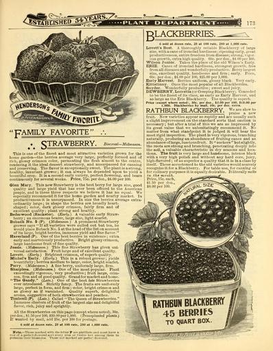 Keywords: Everything for the garden (16231936454).jpg RLAINT DEPARTIVIEIMT' <br> 173 <br> p AMILY FAVORITE <br> STRA ERRY <br> Bisexual ” Midseason <br> This is one of the finest and most attractive varieties grown for the <br> home garden ” the berries average very large perfectly formed and of <br> rich glossy crimson color permeating the flesh almost to the centre <br> rendering it the ideal dessert strawberry and unsurpassed for canning <br> and preserving The flavor is exceptionally sweet The plant is a strong <br> healthy luxuriant grower; it can always be depended upon to yield a <br> bountiful crop It is a second early variety perfect flowering and bears <br> continuously for several weeks Price 75c per doz 4 00 per 100 <br> Glen Mary This new Strawberry is the best berry for large size good <br> quality and large yield that has ever been offered to the American <br> people and in these three respects we believe it has no equal We <br> especially recommend it for the home garden and nearby market In <br> productiveness it is unsurpassed In size the berries average extra- <br> ordinarily large ; in shape the berries are broadly heart- <br> shaped ; color dark glossy crimson fairly firm and of <br> excellent quality; plant strong and healthy <br> Bederwood Rackster Early A valuable early Straw- <br> berry ; an enormous bearer large size light scarlet <br> Bubacb No 5 P Midseason A prominent Strawberry <br> grower says If all varieties were culled out but ten he <br> would place Bubach No 5 at the head of the list on account <br> of its large bright berries immense yield and fine flavor <br> Haverland P One of the best berries in existence ; extra <br> early and marvelously productive Bright glossy crimson <br> large handsome fruit of fine quality <br> Jessie Midseason This fine Strawberry has given uni- <br> versal satisfaction Fruit large and of excellent quality <br> Lovett Early Brightest crimson of superb quality <br> Michel's Early Early This is a robust grower ; yields <br> bountifully ; berries medium to large color bright scarlet <br> Parry Midseason A fine berry uniformly large firm <br> Sharpless Midseason One of the most popular Plant <br> exceedingly vigorous very productive ; fruit large crim- <br> son firm and of good quality Grand for market and home <br> The Gandy Late One of the best late Strawberries <br> ever introduced Strictly fancy The fruits are uniformly <br> large perfect in form and firm ; color bright crimson and <br> as glossy as if varnished Quality superb delightful <br> aroma suggestive of both strawberries and peaches <br> Timbrell P Late Called The Queen of Strawberries <br> Immense clusters of fruit of the largest size and delightful <br> flavor rich juicy and sprightly <br> All the Strawberries on this page except where noted 30c <br> per doz SI 50 per 100 10 00 per 1 000 Transplanted plants <br> If wanted by mail add 25c per 100 for postage <br> 6 sold at dozen rate 25 at 100 rate 250 at 1 000 rate <br> p LACKBERRIES <br> 6 sold at dozen rate 25 at 100 rate 250 at 1 000 rate <br> Lovett's Best A thoroughly reliable Blackberry of large <br> size with a cane of ironclad hardiness ; ripening early great <br> productiveness entire freedom from disease; strong vigor- <br> ous growth extra high quality 60c per doz 4 00 per 100 <br> Wilson Junior Takes the place of the old Wilson's Early <br> ERIE Canes of ironclad hardiness strongest growth free <br> from all diseases and wonderfully productive Berry largest <br> size excellent quality handsome and firm ; early Price <br> 60c per doz 4 00 per 100 25 00 per 1 000 <br> Early Harvest Berries uniform glossy black Very early <br> Kittatinny Once the most popular of all Blackberries <br> Snyder Wonderfully productive ; sweet and juicy <br> DEWBERRY Lucretia or Creeping Blackberry Conceded <br> to be the finest of its class as early as Early Harvest and <br> as large as the Erie Blackberry The quality is superb <br> Price except where noted 50c per doz 3 00 per 100 15 00 per <br> 1 000 Blackberries by mail 10c per doz extra <br> RATHBUN BLACKBERRY <br> We are slow to <br> praise a new <br> fruit New varieties appear so rapidly and are usually such <br> a slight improvement on the standard sorts that caution is <br> necessary ; but after a trial of this we are so impressed by <br> its great value that we unhesitatingly recommend it No <br> matter from what standpoint it is judged it will bear the <br> most rigid inspection The plant is very vigorous branching <br> naturally producing an abundance of fruiting canes and an <br> abundance of large lusciousf ruit It suckers but slightly <br> the roots are strong and branching penetrating deeply into <br> the soil a valuable characteristic in dry seasons and loca- <br> tions The fruit is very large and handsome intense black <br> with a very high polish and without any hard core juicy <br> high-flavored ; of so superior a quality that it is in a class by <br> itself Those accustomed to the old varieties would scarcely <br> recognize it for a Blackberry For table use for canning or <br> for culinary purposes it is equally desirable It literally melts <br> in the mouth <br> Price 15c each <br> 1 50 per doz <br> 8 00 per 100 <br> Xfote ” Those marked with the letter P are pistillate and must have a <br> row of a perfect-flowered sort every nine or twelve feet among them to <br> poUenize their blossoms Those not marked are perfec -flowered 42383262 133997 66553 Page 173 Text http //www biodiversitylibrary org/page/42383262 1902 10 5962/bhl title 66553 Henry G Gilbert Nursery and Seed Trade Catalog Collection ; Peter Henderson Co NameFound Lucretia Biodiversity Heritage Library Everything for the garden 1901 Garden Stories Catalogs Flowers Peter Henderson Co Plants Ornamental Seed industry and trade Seeds Trade catalogs Vegetables U S Department of Agriculture National Agricultural Library bhl page 42383262 dc identifier http //biodiversitylibrary org/page/4238326