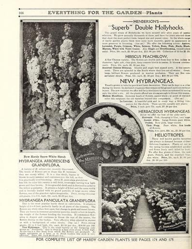 | Keywords: Everything for the garden (16365135166).jpg  166 <br> HENDERSON'S- <br> New Hardy Snow-White Shrub <br> HYDRANGEA ARBORESCENS <br> GKANDIFLOPxA <br> A variety of E arborescens recently discovered <br> The heads of flowers are in shape like H horlensis; <br> they are snowy ˘ white It is a true shrub begins to <br> bloom in early summer and continues into the fall so that <br> it is practically ever-blooming After H paniculala grandijlora <br> has lost its color this variety is still fresh eventually turning to a light <br> green and then brown It is a graceful shrub and is destined to achieve <br> the widest popularity It attains a height of 6 feet and the same width <br> and is literally loaded with its grand panicles of large snowy white <br> flowers one of the grandest sights imaginable Price strong two-year <br> old plants 2 to 3 ft high 50c each So 00 per doz <br> HYDRANGEA PANICULATA GRANDIFLORA <br> This is the most popular hardy shrub in cultivation It attains a <br> height of 4 to 6 feet; perfectly hardy in all parts of the country The <br> flowers are white when first open but change tc pink and russet brown <br> They are borne in immense pyramidal panicles nearly a foot in length <br> the weight of the flowers bending the branches It commences flow- <br> ering in August and continues in bloom the rest of the season the <br> flowers drying on the bushes Very effective when planted in masses <br> or with a background of other shrubs See cut Price strong <br> plants 2i to 3 feet high 25c each 2 50 per doz S18 00 per 100 <br> Tree Hydrangea This is the same -variety as the foregoing only <br> grown as Standards that is there is a bare stem-about 4 feet high <br> At the top is a fine head from which the flowers are produced As <br> single specimens on a lawn or in shrub borders this style is verv <br> effective Price 60c each S6 00 per doz <br> Superb Double Hollyhocks <br> This grand strain of Hollyhocks we have secured only after years of careful <br> selection We grow annually thousands of these and have for years selected those <br> that show the most perfect form largest size and purest color In the whole range <br> of hardy garden plants there were none more majestic gayer in appearance or <br> more generous in blooming See cut We offer the following colors Apricot <br> Lavender Purple Crimson White Salmon Yellow Rose Pink Black Blush <br> Maroon White with Violet Center Also Single and Everblooming mixed colors <br> only Price 20c each 2 00 per doz 12 00 per 100 Collection of 13 for 2 25 <br> HIBISCUS PEACHBLOW <br> A fine Chinese variety The flowers are double and from four to five inches in <br> diameter; light soft clear pink deep crimson blotch in center It blooms continu- <br> ously Price 15c each 1 50 per doz <br> Assorted Chinese Hibiscus Double and single best named sorts A fine assort- <br> ment These are splendid in the South where they live out all winter Great <br> large brilliant flowers produced in wanton profusion They are fine con- <br> servatory shrubs Price 15c each 1 50 per doz ; 10 00 per '100 <br> NEW HYDRANGEAS <br> Usually grown in tubs for porch and lawn decoration They can be kept in a cellar <br> during the winter In sheltered situations they remain in the ground outdoors without <br> injury The new varieties we offer will be a revelation to those accustomed to seeing <br> only the older s rts All the plants offered are strong enough to bloom this season <br> Madam Mouilliere Immense heads of flowers purest white ; in point of size and <br> color this surpasses the old varieties beyond any comparison See cut <br> La Lorraine A beautiful pink and in every way a fitting com- <br> panion for the above These are two notable new plants <br> Price 5 inch pots 75c each 7 50 per doz <br> HERBACEOUS HYDRANGEAS <br> Below we offer the best of the older sorts <br> Hortensis Pink changing to blue very large <br> Jeanne d'Arc Large flowers pure white <br> Otaksa Rosy pink large trusses <br> Thos Hogg Pure white fine heads <br> of flowers <br> Price 5-in pots 60c ea 5 00 per doz <br> HELIOTROPES <br> These well known garden favorites <br> are always in demand because of their <br> delicious fragrance Plants set out in <br> the spring become established quickly <br> and flower freely until killed by frost <br> We offer fine plants of these the new <br> giant French and the standard blue <br> also white Price 10c each 1 00 per <br> doz 6 00 per 100 <br> FOR COMPLETE LIST OF HARDY GAKDEN PLANTS SEE PAGES 174 AND 175 43874958 149634 78295 Page 166 Text http //www biodiversitylibrary org/page/43874958 c1915 10 5962/bhl title 78295 Henry G Gilbert Nursery and Seed Trade Catalog Collection ; Peter Henderson Co NameFound E arborescens NameFound H horlensis NameFound H paniculala grandijlora NameFound Hibiscus NameConfirmed Hibiscus L EOLID 60741 NameFound Hortensis NameConfirmed Hortensis NameBankID 4618629 NameFound Hydrangea NameConfirmed Hydrangea sect Cornidia Ruiz Pav Engl EOLID 40082 NameFound Hydrangea arborescens NameConfirmed Hydrangea arborescens EOLID 583369 NameBankID 2649542 NameFound Hydrangea paniculata NameConfirmed Hydrangea paniculata EOLID 583371 NameBankID 2649544 Biodiversity Heritage Library Everything for the garden 1915 Garden Stories Books Bulbs Plants Catalogs Equipment and supplies Flowers Gardening Lawn mowers Seeds U S Department of Agriculture National Agricultural Library bhl page 43874958 dc identifier http //biodiversitylibrary org/page/43874958 bhlGardenStories BHLinbloom bulbs plants u s department of agriculture national agricultural library bhlgardenstories bhlinbloom Information field Flickr posted date ISOdate 2015-01-28 Check categories 2015 August 25 CC-BY-2 0 BioDivLibrary https //flickr com/photos/61021753 N02/16365135166 2015-08-25 02 54 46 cc-by-2 0 PD-old-70-1923 Everything for the garden 1915 Photos uploaded from Flickr by Fæ using a script |
