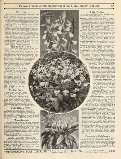 | Keywords: Everything for the garden (16390076302).jpg Crinum <br> If by Parcel Post add Postage at Zone Rates <br> Weights are given <br> Kirkii Produces flowers of the greatest beauty <br> Usually two flower stalks of dark purplish color <br> are sent up at the same time each bearing a large <br> umbel of enormous Lily-like flowers of white with <br> a reddish-purple stripe through the center Extra <br> large bulbs 35c each; 3 50 per doz Weight <br> 1 lb each <br> Powelli Fine hybrids for sunny sheltered situa- <br> tions in the garden forming large clumps and <br> blooming freely during the summer Probably <br> hardy as far north as Washington especially if <br> mulched during the winter The picture on <br> previous page shows some in the border outside <br> of the greenhouses in Kew Gardens England <br> where they have been growing for years Flowers <br> large and Lily-like borne in clusters on strong <br> 3 to 4 foot stems; foliage luxuriant <br> Powelli Roseum Rose-pink flowers <br> Weight 4 lb each <br> Pure white flowers <br> Weight l A lb each <br> 'd Vine <br> ' Postage at Zone Rates <br> gle Bulbs mailed Free <br> 2 50 per doz <br> Powelli Album <br> 3 00 per doz <br> E meral <br> // by Parcel Post ad <br> Weight 1 lb per doz Si <br> This beautiful new hardy vine belongs to the <br> same Dioscorea family as the well-known Cinna- <br> mon Vine but is entirely different and much finer <br> The slender vines are of dense growth and very <br> graceful Leaves of good size forked or divided <br> and of a deep emerald-green with a decided <br> lustre or sheen Flowers in drooping racemes <br> and so numerous as to be a very distinct <br> and attractive feature of the _ vine <br> Tubers round and solid like a Gladiolus <br> bulb therefore convenient to handle <br> Price 15c each; 1 50 per doz <br> Hyacinthus Candicans <br> If by Parcel Post add Postage <br> at Zone Rates Weight 1 4 lbs per <br> doz Single Bulbs mailed Free <br> A luxuriant-growing summer- <br> flowering plant spreading 2 to 3 <br> feet throwing spikes 4 to 5 feet <br> in height each bearing 20 to 30 <br> large white bell-shaped flowers <br> splendid for groups If planted <br> in the center of beds of scarlet <br> Gladiolus the effect is magnifi- <br> cent See cut <br> Price 7c each; 75c per doz ; <br> 5 00 per 100 <br> Madeira Vine <br> // by Parcel Post add Postage <br> at Zone Rates Weight 2 lbs per <br> doz Single Bulbs mailed Free <br> The old favorite Climbing Mig- <br> nonette So much prized for porch- <br> es and arbors on account of its rapid <br> growth and freedom from insects <br> Thick glossy leaves and long hanging <br> stems of feathery fragrant white flowers <br> The tubers we offer are selected large size <br> Price 5c each; 50c per doz ; 3 50 per 100 <br> Milla Biflora t ic F Towe r <br> Flowers star-shaped 2 inches across clear <br> waxy-white of great substance enlivened by <br> a frost-like sparkle; the fragrance is delightful <br> Place a stalk in water and the flowers will all open; <br> we have seen 11 stalks shoot up successively from <br> one bulb Height 12 to 18 inches Price 5c each; <br> 50c per doz ; 4 00 per 100 Mailed Free <br> Montbretia <br> The Montbretia is one of the most floriferous <br> and showy of summer-flowering bulbous plants <br> A dozen or more bulbs planted 6 inches apart in <br> a group in a sunny position and allowed to remain <br> will form magnificent clumps from 2 to 3 feet <br> across producing in great numbers graceful spikes <br> 8 to 12 inches long each spike bearing from 18 to <br> 30 exceedingly showy star-shaped flowers 1 J4 to 2 <br> inches across <br> Montbretia Mixed Hybrids Price 5c each; 50c <br> per doz ; 3 50 per 100 Mailed Free <br> Oxalis Summer-Flowering <br> Valuable for edging walks flower beds etc Bulbs <br> planted 3 in apart form rounded rows about 1 ft <br> high which produce flowers in endless succession <br> Deippi Rosy-white Price 15c per doz ; 1 00 <br> per 100 Mailed Free <br> Lasiandra Rosy-pink Price 15c per doz ; 1 00 <br> per 100 Mailed Free <br> HENDERSON'S BULB CULTURE <br> Lily Bulbs <br> If by Parcel Post add Postage at Zone Rates <br> The Weights per doz 'are given <br> ¢Single Bulbs mailed Free <br> Aura turn ' The Golden-rayed Lily of Japan <br> Flowers pure white with crimson spots; through <br> the center of each petal runs a clear golden band <br> Flowers measure nearly a foot across produced <br> abundantly; delightfully fragrant; 3 to 5 feet <br> First Size Bulbs 15c each; 1 50 per doz ; <br> 10 00 per 100 Weight 3 lbs per doz <br> Extra Large Bulbs 25c each; 2 50 per doz ; <br> 18 00 per 100 Weight 5 lbs per doz <br> Canadense Our beautiful native meadow Lily <br> Bright yellow marked with copious spots of red; <br> 2 to 3 feet high 15c each; 1 50 per doz <br> Weight 134 lbs per doz <br> Elegans Erectum Robustum Flowers very large <br> erect and borne in clusters; orange spotted <br> maroon; 1J feet 15c each; 1 50 per doz <br> Weight 2 lbs per doz <br> Elegans Incomparable Deep ox-blood red spot- <br> ted black 20c each; 2 00 per doz Weight <br> 2 lbs per doz <br> Elegans Leonard Joerg Rich apricot spotted 15c <br> each; 1 50 per doz Weight 2 lbs per doz <br> Elegans Painted Chief Bright flame color 15c <br> each; 1 50 per doz Weight 2 lbs per doz <br> Elegans Aurora Deep rich orange suffused scarlet <br> 20c each; 2 00 per doz Weight 2 lbs per doz <br> Henryi One of the best Lilies for garden culture <br> and massing The flower stalks 3 to 5 feet high <br> each carry 5 to 8 flowers of a rich apricot-yellow <br> lightly spotted with brown 60c each; 6 00 <br> per doz Weight 3 lbs per doz <br> Longiflorum Well-known beautiful snow- <br> white fragrant hardy garden Lily; flowers <br> trumpet-shaped 6 to 8 inches long; height <br> l /2 to 3 feet Price 15c each; 1 50 per <br> doz ; 12 00 per 100 Weight 3 lbs <br> per doz <br> Speciosum or Lancifolium The <br> most popular Lilies grown being <br> easy of cultivation and producing