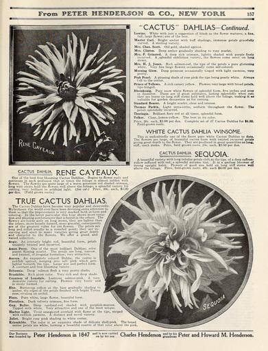 | Keywords: Everything for the garden (16390171002).jpg From PETER HENDEMOM D CO MEW YORE <br> 157 <br> CACTUS DAHL A REN£ QAYEAUX <br> One of the best free blooming Cactus Dahilias Begins to flower early and <br> continues in such profusion that at times the foliage is almost hidden with <br> flowers The flowers are quite large of a warm geranium red shaded crimson <br> long wiry stems hold the flowers well above the foliage; a splendid variety for <br> cutting very brilliant in artificial light See cut Price 50c each 5 00 <br> per doz Field grown roots <br> TRUE CACTUS DAHLIAS <br> The Cactus Dahlias have become very popular and deservedly <br> Hybridizers the world over have been devoting extra attention to <br> them so that the improvement is very marked both in form and <br> coloring In the latter particular this type shows more varia <br> tion and pleasing combinations that is found in the others The <br> flowers are borne airly on long stems they are lighter than <br> the others more loosely formed more graceful consequently <br> are of the greatest value for cut flowers The petals are <br> long and rolled usually to a rounded point; they are in- <br> curving and erect in many varieties giving great depth <br> and character to the flowers We offer a grand and <br> varied collection <br> Aegir An intensely bright red beautiful form petals <br> uniquely twisted and incurved <br> Amos Perry One of the most brilliant Dahlias; color <br> purest flaming scarlet The petals are long narrow <br> and twisted of irregular formation; very attractive <br> Aurora An exquisitely colored Dahlia; the center is <br> reddish apricot merging into soft pink which gets <br> lighter towards the tips Large size and perfect form <br> A constant and free blooming variety <br> Britannia Deep salmon flesh a very pretty shade <br> Brunhilde Rich plum color Very rich and deep shade <br> Countess of Lonsdale Lustrous salmon-pink A very <br> desirable variety for cutting Flowers very freely and <br> is nicely formed <br> Else Buttercup yellow at the base gradually shading to <br> amber the edges of the petals finished with bright Tyrian <br> rose; rivaling an orchid <br> Flora Pure white large flower beautiful form <br> Floradora Dark velvety crimson fine form <br> Oen Buller Deep cardinal-red shaded with purplish-maroon <br> Tipped with white Very attractive and one of the most unique <br> – Harbor Light Vivid orange-red overlaid with flame at the tips striped <br> with reddish carmine A distinct and novel variety <br> Juliet Bright rosy pink shading to white center <br> Kriemhilde The color is an exquisite shade of delicate shell-pink The broad <br> center petals are white forming a beautiful rosette of that color above the pink <br> CACTUS DAHUAS-Continued <br> Lawine White with just a suggestion of blush as the flower matures; a fine <br> full large flower; one of the best <br> Master Carl Bright amber with buff shadings immense petals gracefully <br> curved A sterling variety <br> Mrs Chas Scott Old gold shaded apricot <br> Mrs Clinton Deep amber gradually shading to rosy scarlet <br> Mrs F Grinsted A deep rich crimson lightly shaded with purple finely <br> incurved A L splendid exhibition variety the flowers come erect on long <br> stems <br> Mrs H J Jones Rich salmon-red the tips of the petals a pure glistening <br> white Very fine large flowers occasionally come self-colored <br> Morning Glow Deep primrose occasionally tinged with light carmine very <br> pretty <br> Pink Pearl A pleasing shade of rose pink the tips being pearly white Always <br> full to the center <br> Prince of Yellows A rich canary yellow Flowers very large with broad petals <br> tips fringed <br> Rheinkonig Pure snow white flowers of splendid form five inches and over <br> in diameter These are of great substance lasting splendidly when cut; <br> they are borne on long stiff stems held well above the foliage making it as <br> valuable for garden decoration as for cutting <br> Standard Bearer A bright scarlet clear and intense <br> Thomas Parkin Light terra-cotta uniform throughout the flower The <br> petals splendidly incurved <br> Thuringia Brilliant fiery red at all times splendid form <br> Volker Clear lemon-yellow The best in its color <br> Price 20c each 2 00 per doz Complete set of 27 Cactus Dahlias for 4 60 <br> Field-grown roots <br> WHITE CACTUS DAHLIA WINSOME <br> This is undoubtedly one of the finest pure white Cactus Dahilas to date <br> The flowers are large of beautiful cactus form with twisted incurved petals <br> giving great depth to the flower They are produced in great quantities on long <br> stiff erect stems Price field grown roots 25c each 2 50 per doz <br> CACTUS DAHLIA SEQUOIA <br> A beautiful variety with long tubular petals cleft at the tips of a deep saffron- <br> yellow suffused with red; a splendid autumn tint It is a profuse bloomer of <br> strong upright habit Flowers of good size held on long stiff stems well <br> above the foliage Price field-grown roots 40c each 4 00 per doz <br> Our Business <br> was founded by <br> Peter Henderson in 1 847 <br> and is now carried <br> on by his son <br> Charles Hend <br> -son g cSons Peter and Howard M Henderson 43874949 149634 78295 Page 157 Text http //www biodiversitylibrary org/page/43874949 c1915 10 5962/bhl title 78295 Henry G Gilbert Nursery and Seed Trade Catalog Collection ; Peter Henderson Co NameFound Aegir NameConfirmed Aegir NameBankID 4054097 NameFound Britannia NameFound Dahlia sequoia NameFound Thuringia NameConfirmed Thuringia NameBankID 4928944 Biodiversity Heritage Library Everything for the garden 1915 Garden Stories Books Bulbs Plants Catalogs Equipment and supplies Flowers Gardening Lawn mowers Seeds U S Department of Agriculture National Agricultural Library bhl page 43874949 dc identifier http //biodiversitylibrary org/page/43874949 bhlGardenStories BHLinbloom bulbs plants u s department of agriculture national agricultural library bhlgard