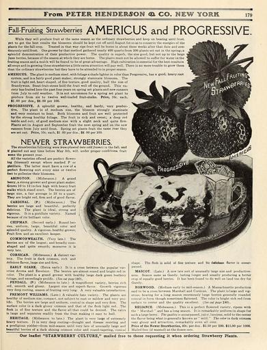 | Keywords: Everything for the garden (16390212092).jpg  From FETE <br> H C <br> 179 <br> una <br> FallFruiting Strawberries AMERICUS and PROGRESSIVE <br> While they will produce fruit at the same season as the ordinary strawberries and keep on bearing until frost <br> yet to get the best results the blossoms should be kept cut off until August 1st so as to conserve the energies of the <br> plants for the fall crop Treated in that way ripe fruit will be borne in about three weeks after that date and con- <br> tinuously until frost One grower by that method gathered nearly 400 quarts from 500 plants set out in the spring; a <br> splendid demonstration of their productive power The quality is superb the size good but not up to the Jarge <br> June berries because of the season at which they are borne The plants must not be allowed to suffer for water in the <br> fruiting season and a mulch will be found to be of great advantage High cultivation is essential for the best resultsia <br> all crops and in growing these strawberries a little extra attention will pay well There is no more trouble to grow them <br> than the ordinary strawberries but they have to be attended to in proper season <br> AMERICUS The plant is medium sized with foliage a shade lighter in color than Progressive has a good heavy root <br> system and is a fairly good plant maker; strongly staminate blossoms The <br> fruit is light red heart shaped of fine texture good quality half the size of <br> Brandywine Stout fruit-stems hold the fruit well off the ground This va- <br> riety has fruited here the past four years on spring set plants and new runners <br> from July to cold weather It is not uncommon for a spring set plant to <br> produce from six to twelve well-loaded fruit-stalks Price 10c each <br> 1 00 per doz 8 00 per 100 <br> PROGRESSIVE A splendid grower healthy and hardy very produc- <br> tive The plant is of medium size the blossom strongly staminate <br> and very resistant to heat Both blossoms and fruit are well protected <br> by the strong healthy foliage The fruit is rich and sweet; a deep red <br> inside and out; of good medium size with a slight neck and quite firm <br> Plants set in August and September fruit the next spring and on the new <br> runners from July until frost Spring set plants fruit the same year they <br> ˘re set out Price 10c each 1 00 per doz 8 00 per 100 <br> NEWER STRAWBERRIES <br> The strawberries following were transplanted into cold frames in the fall and <br> It planted out any time before May 5th will under proper conditions fruit <br> some the present year <br> All the varieties offered are perfect flower- <br> ing bisexual except where marked P or <br> pistillate The latter must have a row of a <br> perfect flowering sort every nine or twelve <br> feet to pollenize their blossoms <br> ABINGTON Midseason A grand <br> berry a strong grower and great plant maker <br> Grows 10 to 12 inches high with heavy fruit <br> – talks which stand erect The berries are of <br> large size a fair average is 25 to a quart <br> They are bright red firm and of good flavor <br> CARDINAL P Midseason The <br> berries are large and beautiful perfectly <br> delicious The plant is ideal strong and <br> vigorous It is a pistillate variety Named <br> because of its brilliant color <br> CHIPMAN Second early Round ber- <br> ries uniform large beautiful color and <br> splendid quality A vigorous healthy grower <br> Fruit firm and an excellent keeper <br> COMMONWEALTH Very late The <br> berries are of the largest ; and broadly cone- <br> shaped and quite smooth; moreover it is <br> very late <br> CORSICAN Midseason A distinct var- <br> iety The fruit is dark crimson rich and <br> delicious flavor large size and firm <br> EARLY OZARK Extra early It is a cross between the popular var- <br> ieties Aroma and Excelsior The berries are almost round and bright red in <br> color The plant is a grand grower with healthy large dark green leathery <br> foliage and exceedingly prolific See cut page 180 <br> FENDALL P Midseason to late A magnificent variety berries rich <br> red smooth and glossy Largest size and superb flavor Growth vigorous <br> very deep rooting season of fruiting very long A very valuable introduction <br> FREMONT WILLIAMS Late A valuable late variety The plants are <br> healthy of medium size compact not subject to rust or mildew and very pro- <br> lific The berries are large and uniform conical in shape and very firm The <br> surface color is a dark glossy crimson and that of the flesh light red The <br> flesh is of fine texture and the flavor all that could be desired The calyx <br> is large and separates readily from the fruit making it easy to hull <br> HERITAGE Midseason to late The plant is very large of extremely <br> heavy texture It is very deep rooting ” drought and disease resisting and <br> a prodigious yielder ” from mid-season until very late of unusually large and <br> beautiful berries of a dark shining crimson color and round-tapering conical <br> shape The flesh is solid of fine texture and Its delicious flavor is unsur- <br> passed <br> MASCOT Late A new late sort of unusually large size and productive- <br> ness Season same as Gandy lasting longer and usually producing a better <br> crop of equally good berries It has been found to do well on land too dry for <br> Gandy <br> NORWOOD Medium early to mid-season A Massachusetts production <br> said to be a cross between Marshall and Corsican The plant is large and vig- <br> orous bearing for a long season enormously large berries generally rounded <br> conical in form though sometimes flattened The color is bright rich red from <br> surface to center and the quality excellent See cut page 180 <br> RELIANCE Midseason This is a perfect flowered variety ripens with <br> the Marshall and has a long season It is remarkably uniform in shape for <br> such a large berry The quality is unsurpassed juicy luscious solid to the center <br> t