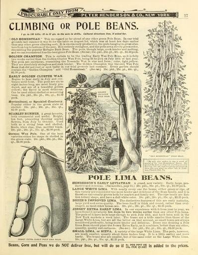| Keywords: Everything for the garden (16646094272).jpg P PETER HENDERSON A CO MEW YORK- <br> 27 <br> CLIMBING OR POLE BEANS <br> / qt to ISO hills; 10 to 12 qts to the acre la drills Cultural directions free If asked for <br> OLD HOMESTEAD This we regard as far ahead of any other green Pole Bean In our trial <br> grounds last summer it was fit for the table on August 1st which was at least ten days earlier <br> than any other green climbing sort It is enormously productive the pods hanging in great clus- <br> ters from top to bottom of the pole It is entirely stringless and the pods are a silvery green color <br> resembling the popular Refugee Bush Bean The pods though large cook tender and melting <br> and we can recommend it as the best green Pole Bean Seecut 15c plit 25c pt 40c qt 2 50 peck <br> GOLDEN CHAMPION This is certain to be the leading Early Wax Pole Bean as it is fully <br> two weeks earlier than the Golden Cluster Wax Pole being fit to pick on July 24th of last year <br> The pods are enormous resembling the Yosemite Wax in size and form ; color light yellow <br> They are absolutely stringless and cook tender The Golden Champion was the only Wax Pole <br> Bean that did not rust or spot badly in our trial grounds last summer Every garden should <br> contain the Golden Champion and Old Homestead See cut 15c pkt 25c pt 40c qt <br> 2 50 peck <br> EARLY GOLDEN CLUSTER WAX <br> Begins to bear earlj- in July and con- <br> tinues until frost The pods are six to <br> eight inches long are most freely pro- <br> duced and are of a beautiful golden <br> yellow; the flavor is most delicious <br> Can be used eitlier shelled or as a string <br> bean 15c pkt 25c pt 40c qt 2 50 <br> peck <br> Horticultural or Speckled Cranberry <br> Popular either in the green state or <br> shelled 10c pkt 20c pt 35c qt <br> S2 00 peck <br> SCARLET RUNNER A great favorite <br> both ornamental and useful Height <br> ten feet presenting dazzling scarlet <br> flowers from July to October Used <br> both as a string bean and shelled <br> Seeds when ripe lilac mottled black <br> 10c pkt 20c pt 35c qt 2 00 peck <br> German Wax Pole One of the best <br> varieties either for snaps Or shelled in <br> the green state 10c pkt 20c pt 35c <br> qt 2 00 peck <br> JERSEY EXTBA EARLY POLE LIMA BEAN <br> OLD HOMESTEAD POLE BEAN <br> My wife also wishes to say a word of n <br> praise of the Old Homeste \d' Beans She <br> picked the first on July T-id and they are still s <br> bearing Oct 8th and everybody pronounced 0 <br> them fine and want no other - D Post- U <br> ELL Church Hill Pa m <br> POLE LIMA BEANS <br> HENDERSONS EARLY LEVIATHAN A grand new variety Early large pro- <br> ductive and delicious See novelties page 11 20c pkt 35c pt 60c qt 4 00 peck <br> LARGE WHITE LIMA With nearly every one the beans either green or ripe of <br> this variety are considered the most tender and d 4icious of the Bean family and it is <br> therefore universally grown both for market and family use The ripe beans are flat- <br> tish kidney shape and have a dull white color 10c pkt 20c pt 35c qt 2 25 peck <br> DREER'S IMPROVED LIMA The distinctive features of this are early maturity <br> large yield and extra quality The bean itself is thick and round rather than oval- <br> shaped as most other Limas are 10c pkt 20e pt 35c qt S2 25 peck <br> JERSEY EXTRA EARLY LIMA In our experience with it from year to year we <br> have found it invariably ten days to twro weeks earlier than any other Pole Lima <br> The pods of it have been large enough to pick July 24th and have been sold in the <br> New Yoik mai'kets a week later The beans are a trifle smaller than those of the <br> Large Wliite Lima but are all the better on that account as small beans are always <br> considered preferable being more tender and delicious Every one desiring a Pole <br> Lima Bean should plant the Jersey Extra Early as it combines better than any other <br> quantity quality and earliness See cut 15c pkt 25c pt 40c qt SioO peck <br> SMALL LIMA or SIEVA A variety of the large White Lima The pods however <br> are much smaller usually about three Inches long It is a little earlier and more <br> hardy The beans also are smaller but of the same color as the Large White Lima <br> 10c pkt 20c pt 35c qt 2 25 peck <br> Beans Corn and Peas we do NOT deliver free but will do so if fS f 'PART »§ a Jded to the prices 42383136 133997 66553 Page 27 Text http //www biodiversitylibrary org/page/42383136 1902 10 5962/bhl title 66553 Henry G Gilbert Nursery and Seed Trade Catalog Collection ; Peter Henderson Co NameFound Limas NameConfirmed Limas NameBankID 4220815 Biodiversity Heritage Library Everything for the garden 1901 Garden Stories Catalogs Flowers Peter Henderson Co Plants Ornamental Seed industry and trade Seeds Trade catalogs Vegetables U S Department of Agriculture National Agricultural Library bhl page 42383136 dc identifier http //biodiversitylibrary org/page/42383136 BHLinbloom bhlGardenStories peter henderson co plants ornamental u s department of agriculture national agricultural library bhlinbloom bhlgardenstories Information field Flickr posted date ISOdate 2015-02-25 Check categories 2015 August 24 CC-BY-2 0 BioDivLibrary https //flickr com/photos/61021753 N02/16646094272 2015-08-24 22 55 33 cc-by-2 0 PD-old-70-1923 Everything for the garden 1902 Photos uploaded from Flickr by Fæ using a script |