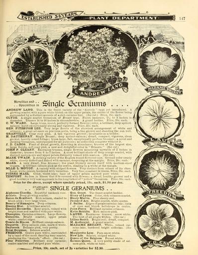 | Keywords: Everything for the garden (16646952847).jpg flovelties anD <br> Specialties <br> – n Single Geraniums <br> ANDREW LANG This is the finest variety of the Aureole type j-et introduced A <br> glowing scarlet with a pure white blotch on the upper petals the centre of the flower being <br> surrounded by a distinct aureole of a rich carmine tint See cut Price 35c each <br> CLYDE A single scarlet Geranium of Bruant type Floret immense 213 to 3 inches in <br> diameter Trusses 14 to 16 inches in circumference A grand bedder Price 35c each <br> C W WARD Large truss round perfecllj- formed flowers ; color a brilliant deep apricot- <br> salmon; habit exceptionally strong and vigorous Price ¢25c each <br> GEN PITZHUGH LEE Very large florets of the showiest arrangement of white and <br> crimson ; a great advance on previous sorts being a fine grower and standing the sun well <br> GRANVILLE Clear rosy pink A tall vigorous grower; invaluable as a bedder <br> H DAUTHENAY Single Bruant; deep apricot-salmon; dwarf compact vigorous clean <br> grower heavily zoned foliage ; truss large full exceptionally profuse bloomer ; a novel and <br> striking Geranium unsurpassed for all purposes; no collection complete without it <br> J D CABOS Plant of dwarf growth flowering in abundance; trusses of the largest size <br> large florets soft rosy pink a new and delightful color in Bruants See cut <br> JOHN P CLEARY Enormous trusses single flowers measuring upwards of 2 inches in <br> diameter ; trusses from 6 to 7 inches A most brilliant shade of deep orange-scarlet with <br> distinct maroon eye and upper petals distinctly veined with maroon See cut <br> MARK TWAIN A striking variety of the English round-flowered tj-pe Ground color nearly <br> white closely dotted and flaked with carmine deepening at the margin Price 20c each <br> MARS A very dwarf free bloomer; the plant literally covers itself with medium-sized <br> trusses A brilliant salmon-pink at the centre shading to a white at the margin <br> MLLE L MOYOT A variety with striped flowers Very distinct from others of its class <br> Large white centre bordered with vermilion Very free constant in bloom Price 35c each <br> PIERRE MAEL Color violet-lake; base of upper petals marked pure white <br> TEMPEST So free in bloom that it is covered with flowers ; a dwarf healthy grower and a <br> good bedder; a very near approach to the long talked of yellow Geranium Price 35c each <br> Price for the above except where specially priced 15c each 1 50 per doz <br> STANDARD <br> SORTS <br> SINGLE GERANIUMS <br> Alphonse Chardln Beautiful nankeen rose <br> Athlete Deep glowing scarlet <br> Baron de Scalibert Rich salmon shaded to <br> blush pink ; very large truss <br> Beauty of Ramsgate Deep crimson <br> Blazing Star A brilliant scarlet <br> Camilla Bernardin Eosy peach veined with <br> bright rose and marbled with pure white <br> Champion Carmine-crimson Large flowers <br> Columbia Bright scarlet; upper petals <br> white ; scarlet edges <br> Comte de Blacas Brilliant orange-salmon <br> Coquette Deep salmon-pink marked white <br> Daybreak Delicate pink very pretty <br> Ernst Bergman Intense scarlet <br> FREEDOM Centre pure white surrounded <br> by a band of the most dazzling rosy scarlet <br> producing the Aureole effect See cut <br> Pleur Poitevine Brilliant rosy carmine; <br> centre marbled and striped pure white <br> Geu Grant The finest scarlet bedder <br> Glory of Lyons Color rich crimson-scarlet <br> Henry Martin Fine cherry-red <br> Jeanne d'Arc Bright scarlet white centre <br> J Sallier Edgesof petals carmine-lake tints <br> of rose and bluish heliotrope in centre <br> Jules Ferry Brilliant carmine-crimson <br> Katie Scliultz Rich salmon-pink <br> L'AUBE Enormous trusses snow-white <br> Tlie best of all single whites See cut <br> Lillian Smith Bright red ; dwarf compact <br> M Andreujol A grand scarlet <br> MADAME BRUANT White veined <br> mine-lake bordered bright solferino <br> cut <br> Marguerite Lyer Pure snow-white <br> Newr Life Scarlet striped white <br> Queen of the Belgians Purest white <br> Salmon Queen A very pretty shade of sal- <br> mon-pink white at base <br> Price 10c each set of 2g varieties for 2 50 <br> car- <br> See 42383236 133997 66553 Page 147 Text http //www biodiversitylibrary org/page/42383236 1902 10 5962/bhl title 66553 Henry G Gilbert Nursery and Seed Trade Catalog Collection ; Peter Henderson Co NameFound Camilla NameConfirmed Camilla EOLID 55182 NameBankID 379667 Biodiversity Heritage Library Everything for the garden 1901 Garden Stories Catalogs Flowers Peter Henderson Co Plants Ornamental Seed industry and trade Seeds Trade catalogs U S Department of Agriculture National Agricultural Library bhl page 42383236 dc identifier http //biodiversitylibrary org/page/42383236 bhlGardenStories Gernaiums Single Geraniums J P Cleary J D Cabos Freedom L'Aube Madame Bruant Andrew Lang BHLinbloom peter henderson co plants ornamental u s department of agriculture national agricultural library bhlgardenstories single geraniums j p cleary j d cabos l'aube madame bruant andrew lang bhlinbloom Information field Flickr posted date ISOdate 2015-03-18 Check categories 2015 August 24 CC-BY-2 0 BioDivLibrary https //flickr com/photos/61021753 N02/16646952847 2015-08-24 20 57 37 cc-by-2 0 PD-old-70-1923 Andrew Lang Everything for the garden 1902 Photos uploaded from Flickr by Fæ using a script |