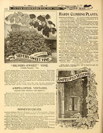 | Keywords: Everything for the garden (16646997877).jpg 5 <br> 170 <br> ˘PETER HENDERSON a CO NEW YORK <br> Hardy Climbing Plants <br> Ampelopsis Dissecta A variety having handsomely <br> cut graceful foliage Exceedingly ornamental as a <br> pillar or porcli vine Price 25c each <br> Ampelopsis Sieboldii Very ornamental foliage exquis- <br> itely variegated with creamy white pink and dark <br> green marbled and veined A handsome vine for any <br> purpose Price 25c each <br> Ampelopsis Quinquefolia The old Virginia Creeper <br> Large plants 30c each i for 1 00 <br> Akebia Quinata Rich dark green foliage and curious <br> lark brown flowers; delicious odor Price 30c each <br> Apios Tuberosa Tuberous-rooted Wistaria Clusters <br> of rich deep purple flowers which have a strong de- <br> licious violet fragrance Price 15c each <br> Aristolochia Sipho Dutchman's Pipe Large showy <br> light green foliage ; flowers long and pipe-shaped ; <br> makes a dense screen Price 50c each <br> Bignonia Radicans Trumpet Creeper Rich orange- <br> scarlet An exceedingly handsome vine 25c each <br> Chinese Matrimony Vine Lycium Chinense Bright <br> purple flowers succeeded by brilliant scarlet berries <br> 2-year-old plants 30c each Young plants 15c each <br> Celastrus Scaudens Bitter Sweet A well-known <br> handsome climbing plant Price 40c each 3 for 1 00 <br> Ivy English Price 25c each 5 for 1 00 <br> Hardy Yellow Jasmine Jasminum nudiflorum Bright <br> yellow fragrant blossoms Price 25c each <br> Hardy White Jasmine Jasminum Officinalis Very <br> sweet-scented and highly desirable Price 25c each <br> Wistaria Sinensis White Flowers borne in long <br> droojiing clusters pure wliite Price 50c each <br> Wistaria Blue Flowers in drooping clusters soft <br> lavender-blue Price 35c each 3 for SI 00 <br> SILVERY SWEET VINE <br> Actiaidia Polygama True <br> A new hardy climber from Japan of remarkable beauty The foliage <br> on the ends of the flowering shoots is of a glistening silvery-white color <br> giving the whole vine from a little distance the appearance of being <br> covered with large white flowers blooming among its bright green <br> leaves The effect is very marked and beautiful The flowers which <br> appear in this latitude about the middle of June lasting from two to <br> three weeks are creamy wliite in color with numerous stamens with <br> bright -ellow anthers and remarkablj' sweet resembling the Lily of the <br> Valley in fragrance See cut <br> Price 1st size extra strong vines 75c each ; 2d size strong 2-year <br> vines 60c each ; 3d size strong 1-year vines -lOc each S4 00 per doz <br> AMPELOPSIS VEITCHII <br> Sometimes called Boston Ivy and Japan Ivy <br> Entirely hardy in the most exposed places attaining a height of 20 to <br> 30 feet in two or three years clinging to stones brick or wood work with <br> the greatest tenacity It is a great protection to houses as the leaves <br> lapping over each other like slates on a roof effectually prevent rain <br> from penetrating the walls For covering dead trees gate posts bound- <br> ary walls etc it has no equal In the summer the foliage is a rich shade <br> of green but in the fall it assumes the most gorgeous tints of scarlet <br> crimson and orange so dazzling as to be seen at a great distance See cut <br> Price extra strong pot-grown plants 25c each 2 50 per doz 15 00 <br> per 100 ; 2d size 15c each 1 50 per doz 10 00 per 100 <br> HONEYSUCKLES <br> Lonicera Belgica Monthly Fragrant or Dutch Honeysuckle Flowers <br> bright red with yellow and buff markings at the ends of the tubes <br> Price 50c each 5 for 2 00 <br> Lonicera Flexuosa Japan Sweet-scented Honeysuckle Large flowers ; <br> pale yellow and white Foliage numerous and dark-colored <br> Iionicera Halleana Hall's Japan Honeysuckle Pure white flowers <br> changing to yellow Very free blooming and fragrant <br> Lonicera Brachypoda Evergreen Sweet-scented Honeysuckle Flowers C <br> buff yellow and white One of the most vigorous and hardy Cl <br> Lonicera Brachypoda Aurea Golden-leaved Honeysuckle Flowers V <br> yellow Foliage beautifully veined and mottled golden yellow <br> Price except where noted large plants 25c each 5 for 1 00 12 00 per <br> 100 Young plants lOe each 1 00 per doz <br> NOTE ” Hardy Climbing Roses will be ouad on page 133 <br> Hardy Clematis on page 160 42383259 133997 66553 Page 170 Text http //www biodiversitylibrary org/page/42383259 1902 10 5962/bhl title 66553 Henry G Gilbert Nursery and Seed Trade Catalog Collection ; Peter Henderson Co NameFound Akebia NameConfirmed Akebia Decne EOLID 61057 NameFound Ampelopsis NameConfirmed Ampelopsis Michx EOLID 59273 NameFound Ampelopsis veitchii NameConfirmed Ampelopsis veitchii NameBankID 5893640 NameFound Apios NameConfirmed Apios EOLID 28882 NameBankID 2650415 NameFound Aristolochia NameConfirmed Aristolochia aff ringens 2283 EOLID 11921687 NameFound Bignonia NameConfirmed Bignonia L EOLID 70924 NameFound Brachypoda NameConfirmed Brachypoda EOLID 279 NameBankID 2696213 NameFound Celastrus NameConfirmed Celastrus EOLID 50553 NameBankID 2651753 NameFound CLEMATIS NameConfirmed Clematis ser Alpina W J Yang L Qian Li EOLID 38289 NameFound Flexuosa NameConfirmed Flexuosa NameBankID 5100695 NameFound Jasminum NameConfirmed Jasminum EOLID 61788 NameBankID 2655499 NameFound Jasminum nudiflorum NameConfirmed Jasminum nudiflorum EOLID 487208 NameBankID 2667662 NameFound Lonicera NameConfirmed Lonicera EOLID 60796 NameBankID 2657168 NameFound Lycium NameConfirmed Lycium EOLID 11196477 NameBankID 2653612 NameFound Polygama NameFound Quinata NameConfirmed Quinata NameBankID 4719227 NameFound Quinata NameConfirmed Quinata NameBankID 4899097 NameFound Quinquefolia NameFound Sipho NameConfirmed Sipho EOLID 16239689 NameBankID 4344323 NameFound TUBEROSA NameConfirmed Tuberosa NameBankID 4880980 NameFound Wistaria NameConfirmed Wistaria NameBankID 8859180 Biodiversity Heritage Library Everything for the garden 1901 Garden Stories Catalogs Fl