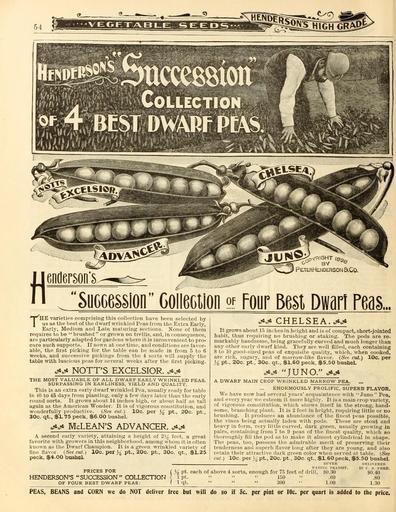 | Keywords: Everything for the garden (Page 54) (16621200776).jpg 54 <br> iid rf fc i i iqH i i i -m- <br> mm- <br> '4 '\ - <br> 'mxfi- <br> H <br> ti <br> Succession GoiieGiion of Four Best Dwarf Peas <br> THE varieties comprising this collection liave been selected by <br> us as the best of the dwarf wrinliled Peas from the Extra Early <br> Earlj' Medium and Late maturing sections None of them <br> requires to be brushed or grown on trellis and in consequence <br> are particularly adapted for gardens where it is inconvenient to pro- <br> cure such supports If sown at one time and conditions are favor- <br> able the first picking for the table can be made in from 5 to 6 <br> weeks and successive pickings from the 4 sorts will supply the <br> table with luscious peas for several weeks after the first picking <br> J- NOTT S EXCELSIOR <br> THE MOST VALUABLE OF ALL DWARF EARLY WRINKLED PEAS <br> SURPASSING IN EARLINESS YIELD AND QUALITY <br> This is an extra early dwarf wrinkled Pea usually ready for table <br> in -10 to 45 days from planting only a few days later than the early <br> round sorts It grows about 14 inches high or about half as tall <br> again as the American Wonder It is of vigorous constitution and <br> wonderfully productive See cut 10c per i pt 20c pt <br> 30c qt 1 75 peck 6 00 bushel <br> e McLEAN S ADVANCER <br> A second early variety attaining a height of 2' feet a great <br> favorite with growers in this neighborhood among whom it is often <br> known as the Dwarf Champion It is a green wrinkled variety of <br> fine flavor See citi 10 c per 3 pt 20c pt 30c qt 1 25 <br> peck 4 00 busbeL <br> CHELSEA <br> It grows about l 'j inches in height and is of compact short-jointed <br> habit thus requiring no brushing or staking The pods are re- <br> markably handsome being gracefully curved and much longer than <br> any other early dwarf kind They are well filled each containing <br> 8 to 10 good-sized peas of exquisite quality which when cooked <br> are rich sugary and of marrow-like flavor See cwt 10c per <br> i pt 20c pt 30c qt 1 60 peck 5 50 bushel <br> A DWARF MAIN CROP WRINKLED MARROW PEA <br> ENORMOUSLY PROLIFIC SUPERB FLAVOR <br> We have now had several years' acquaintance with Juno Pea <br> and every year wo esteem it more highly It is a main crop variety <br> of vigorous constitution which shows itself in the strong hand- <br> some branching plant It is 2 feet in height requiring little or no <br> brushing It produces an abundance of the finest peas possible <br> the vines being actually laden with pods These are stout and <br> heavy in form very little curved dark green usually growing in <br> pairs containing from 7 to 9 peas of the finest quality which so <br> thoroughly fill the pod as to make it almost cylindrical in shape <br> The peas too possess the admirable merit of preserving their <br> tenderness and superb flavor long after they are 3'oung and also <br> retain their attractive dark green color when served at table Sec <br> cut 10c per 1 ; pt 20c pt 30c qt 1 60 peck 5 50 bushel <br> PRICES FOR y pt each of <br> HENDERSON'S SUCCESSION COLLECTION - i pt <br> OF FOUR BEST DWARF PEAS I 1 qt ' <br> DUVER DEMVERED <br> P \yiX ; TRANSIT IN u H EBEB <br> above 4 sorts enough for 75 feet of drill 0 30 0 40 <br> 150 60 80 <br> 300 1 00 1 30 <br> PEAS BEANS and CORN we do NOT deliver free but will do so if 5c per pint or lOc per quart is added to the price 42383095 133997 66553 Page 54 Text http //www biodiversitylibrary org/page/42383095 1902 10 5962/bhl title 66553 Henry G Gilbert Nursery and Seed Trade Catalog Collection ; Peter Henderson Co NameFound Medium NameConfirmed Medium NameBankID 4904049 NameFound None NameConfirmed None EOLID 2913255 Biodiversity Heritage Library Garden Stories Catalogs Flowers Peter Henderson Co Plants Ornamental Seed industry and trade Seeds Trade catalogs Vegetables U S Department of Agriculture National Agricultural Library bhl page 42383095 dc identifier http //biodiversitylibrary org/page/42383095 BHLinbloom peter henderson co plants ornamental u s department of agriculture national agricultural library bhlinbloom Information field Flickr posted date ISOdate 2015-02-25 PD-old-70-1923 Everything for the garden 1902 Photos uploaded from Flickr by FĂŚ using a script Files from the Biodiversity Heritage Library released as Attribution-NonCommercial-ShareAlike |