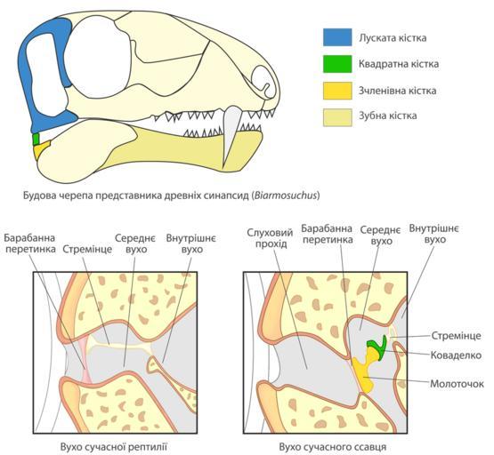 Keywords: Evolution of mammalian auditory ossicles.png uk Виникнення слухових кісточок ссавців а исунку зве ху зоб ажена будова че епа п едставника д евніх синапсид еволюційних п едків ссавців Biarmosuchus зчленівна та квад атна кістки входять до складу суглобу щелепи У ссавців знизу сп ава ці кістки пе етво ились на слухові кісточки молоточок і куваделко відповідно В сучасних ептилій знизу зліва наявна тільки одна слухова кісточка - ст емінце 2013-07-13 19 06 56 own Zlir'a cc-zero Uploaded with UploadWizard Ossicles |