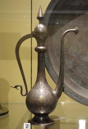 | Keywords: Ewer with a handle and lid, Iran, 18th century, engraved steel, inlaid with gold wire - Royal Ontario Museum - DSC04747.JPG en Exhibit in the Royal Ontario Museum Toronto Ontario Canada This work is old enough so that it is in the public domain Photography was permitted in the museum without restriction 2013-10-08 17 17 20 own Daderot cc-zero Uploaded with UploadWizard Metalwork of Iran in the Royal Ontario Museum | ||||