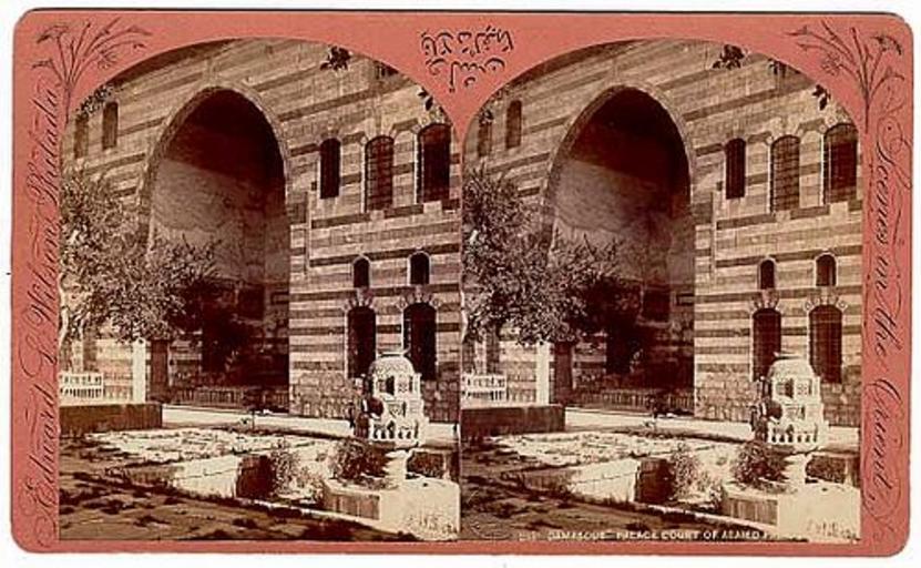 | Keywords: Ewilson-palace-assaied-pasha.jpg Azm Palace in Damascus photographed by American photographer Edward Livingston Wilson circa 1882 http //www luminous-lint com/app/image/5365903535112191400584659/ Luminous-Lint Creator Edward Livingston Wilson ~ 1882 PD-old-100 PD-old-100 Stereo cards by Edward Livingston Wilson Stereo cards of Syria Damascus in the 1880s |