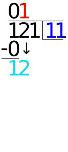 Keywords: Example 121 divided by 11 step 6.svg en Example 121 divided by 11 step 6 2012-06-20 own Averater cc-zero SVG calculus examples Division mathematics Uploaded with UploadWizard SVG files by Averater