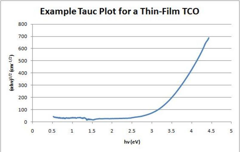 Keywords: Example Tauc Plot.jpg en Typical Tauc plot for an amorphous thin-film transparent conducting oxide TCO Note the distinct linear region which can be extrapolated to the x-axis to determine the material's optical band gap own Mdw730 Plots Optical effects Band gap |