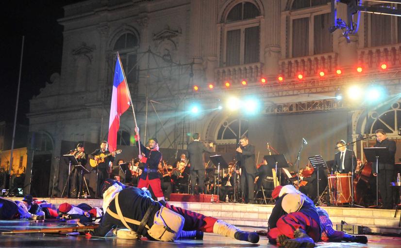 | Keywords: stage music concert hall Con una gran convocatoria y una exitosa puesta en escena, los artistas y músicos que dieron vida al concierto “Cantata de Tarapacá, la Batalla”, se presentaron la noche del viernes en el hemiciclo del Teatro Municipal de Iquique. Este proyecto que fue financiado con recursos del Gobierno Regional, recreó la batalla de Tarapacá ocurrida en noviembre de 1879 en la quebrada esa localidad. Alrededor de 60 personas dieron vida a un espectáculo que tuvo su única función al aire libre y en forma gratuita. Con una gran convocatoria y una exitosa puesta en escena, los artistas y músicos que dieron vida al concierto “Cantata de Tarapacá, la Batalla”, se presentaron la noche del viernes en el hemiciclo del Teatro Municipal de Iquique. Este proyecto que fue financiado con recursos del Gobierno Regional, recreó la batalla de Tarapacá ocurrida en noviembre de 1879 en la quebrada esa localidad. Alrededor de 60 personas dieron vida a un espectáculo que tuvo su única función al aire libre y en forma gratuita. |
