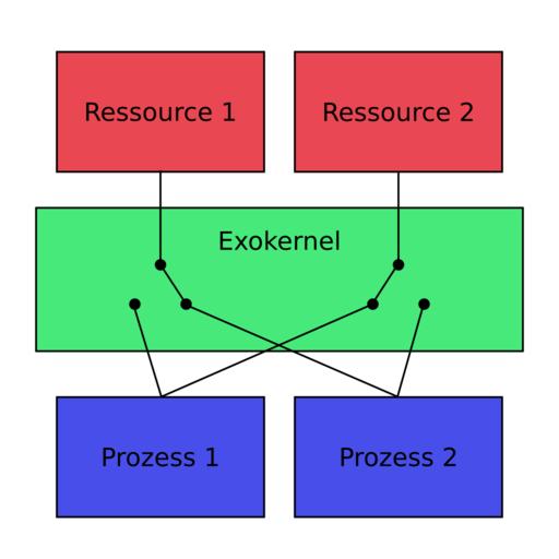 Keywords: Exokernel Schema.svg de Ein Exokernel erlaubt bei Hardware bei der es sonst zu Ressourcenkonflikten kommen würde nur den Zugriff eines Prozesses 2016-12-29 own Zupanto other versions cc-zero Exokernel Computer science diagrams
