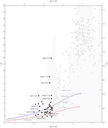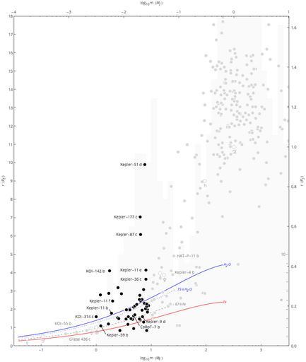 | Keywords: Exoplanet Mass-Radius Scatter Super-Earth.png  black transiting Super-Earths black dots 1px solid black compared with those of white Solar System planets gray circles and 1px solid cdcdcd dadada other transiting exoplanets gray dots 1px solid dadada along with fbfbfb the distribution n light gray bar chart of minimum masses see important note below of transiting and non-transiting exoplanets 1px solid white detected through 2014-04-19 Scales indicate log<sub>10</sub> of planetary mass m expressed as Earth masses bottom and Jupiter masses top ; planetary radius r expressed in Earth radii left and Jupiter radii right ; and counts n gray ticks on right References lines are provided for approximate mass-radius relationships<ref name planetmodels > cite journal Seager S M Kuchner C A Hier-Majumder and B Militzer 2007 Mass-radius relationships for solid exoplanets The Astrophysical Journal 669 1279-1297 http //www iop org/EJ/abstract/0004-637X/669/2/1279/ 10 1086/521346 2014-04-18 </ref> for selected planetary compositions H<sub>2</sub>O - hypothetical pure water ice planet; any planet above this line has a significant H/He envelope; 1px solid blue 75 H<sub>2</sub>O + 3 Fe; 22 MgSiO<sub>3</sub> - water world; 1px dotted blue 67 Fe + 32 5 MgSiO<sub>3</sub> - rocky terrestrial; 1px dashed 808080 Fe - hypothetical pure iron planet exoplanets below this line are not likely 1px solid red Exoplanet data is from the Open Exoplanet Catalogue <ref> cite web http //www openexoplanetcatalogue com Open Exoplanet Catalogue 2014-04-19 2014-04-19 </ref> version https //github com/hannorein/open_exoplanet_catalogue/tree/4945b99b43dbd34703a66d74e1b325325c7d3d2a/systems 4945b99 The figure shows all planets up to 10 M<sub>J</sub> omitting 59 more massive planets and transiting planets up to 18 R<sub>E</sub> omitting an additional 17 with m ‰¤ 10 M<sub>J</sub> but r > 18 R<sub>E</sub> PSR B1257+12 b with m < 10<sup>-4</sup> M<sub>J</sub> lies off to the left of the graph and is also omitted Important note This figure is intended to serve as a catalog of generally accepted candidate exoplanets using the distribution of some of their basic properties related to detection No attempt has been made to characterize the degree of confidence which varies widely in the existence of a given planet or its properties Nor is any attempt made to convey systematic errors associated with a particular method In particular the indicated mass m for an exoplanet characterized using radial velocity is the minimum mass so that the actual distribution of masses for non-transiting planets may be shifted and smeared significantly to the right <references/> Own User Aldaron/Credit false true 2014-04-25 Related graphs <gallery> File Exoplanet_Discovery_Methods_Bar png Exoplanet discoveries by year; color-coded by discovery method File Exoplanet Period-Mass Scatter png Scatter plot of exoplanet period and mass data; color-coded by discovery method </gallery> Astronomy plots Astronomy cluster diagrams Astrobiology Language-neutral diagrams Exoplanet diagrams Scatterplots Super-Earths |