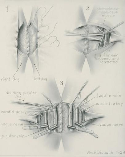Keywords: Experiments in cross circulation using two canines..JPG en Initial stages of surgical procedure whereby the housing for the carotid artery vagus nerve and jugular vein is opened exposing its contents which are labeled and clamped in preparation for further surgery 2013-09-25 12 39 46 Courtesy of the National Library of Medicine Images from the History of Medicine IHM http //ihm nlm nih gov/images/A21180 Also showcased in the book Hidden Treasure New York NY Blast Books 2012 p 138 HMD Prints Photos call number WO 517 C25 no 2b box 19 sub Didusch William P artist and Warfield Firor Custom license marker 2013 09 25 PD-USGov Uploaded with UploadWizard Dog circulatory system Nervus vagus Animal experimentation |