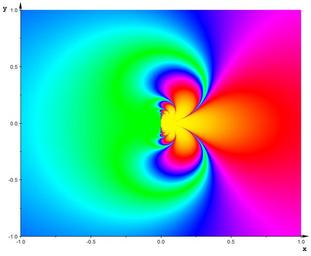 Keywords: Exponential Function (AbsReal Part at Infinity) Density.png Diagram of the absolute value real part of exponetial function in the complex plane as the operand approaches infinity The plot is given by <math>z \bigg \operatorname Re \left \exp \left \frac 1 x + i y \right \right \bigg </math> The colour code is based on the arctan function and therefore emphasises changes at small values more than changes at large values Green is smallest then blue red and yellow largest Own drawing Plotted in MuPAD 2007-04-20 Inductiveload MuPAD Code <pre> f abs Re exp 1/ x+I y ylimit 1 xlimit 1 mesh 1600 hsv x y z -> RGB fromHSV 120+190 arctan z 1 1 cplot plot Density f x -xlimit xlimit y -ylimit ylimit AntiAliased TRUE Mesh mesh mesh AxesTitleFont Courier New Bold 14 TicksLabelFont Arial 10 FillColorFunction hsv YTicksDistance 0 5 XTicksDistance 0 5 plot cplot Axes Frame Width 8 5 unit inch Height 7 unit inch </pre> Complex exponential function Images with MuPad source code |