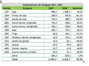 | Keywords: Exportparaguay2007-2008.jpg en Paraguay Ministerio de Industria y Comercio / Riedex publicacion graph of increase 2007 - 2008 of the 12 most important export goods Own Paisano flaco Ministerio de Industria y Comercio / Riedex Economy of Paraguay |