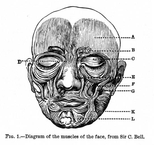| Keywords: Expression of the Emotions Figure 1.png Figure 1 from Charles Darwin's The Expression of the Emotions in Man and Animals showing human facial muscles see also figure 2 and 3 both by Henle the latter of which has the key Caption reads FIG 1 Diagram of the muscles of the face from Sir C Bell Scanned from 1965 version with foreword by Konrad Lorenz published by University of Chicago Press 1844 This is Plate II from Charles Bell's Anatomy and Philosophy of Expression 1844 third edition See footnote on p 2 of Expressions introduction Public domain PD-old Human faces in art Anatomical plates and drawings of muscles Face and neck muscles The Expression of the Emotions in Man and Animals Plates and drawings of human anatomy from The Anatomy and Philosophy of Expression 6th ed 1872 by Charles Bell 19th-century diagrams Language-neutral diagrams Orbicularis oculi muscles Procerus muscles Nasalis muscles Depressor anguli oris muscles |