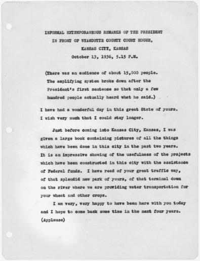 Keywords: Extemporaneous remarks in front of Wyandotte County Court House, Kansas City, KS. - NARA - 197637.tif Scope and content General notes 197637 Local identifier President 1933-1945 Roosevelt 1933 - 1945 NARA-Author Roosevelt Franklin D Franklin Delano 1882-1945 Author 1301590 <br /> Franklin D Roosevelt Library NLFDR 4079 Albany Post Road Hyde Park NY 12538-1999 1936-10-13 Record group Collection FDR-PPF Papers as President President's Personal File 1933 - 1945 Record group ARC 1185 Speeches of President Franklin D Roosevelt compiled 1933 - 1945 Series ARC 197300 File unit First Carbon Files 1933 - 1945 File unit ARC 197301 Variant control numbers NAIL Control Number NLR-PPF-1820-1STCARBON-SC89 yes Other versions <gallery> File Extemporaneous_remarks_in_front_of_Wyandotte_County_Court_House _Kansas_City _KS _-_NARA_-_197637 tif tif File Extemporaneous_remarks_in_front_of_Wyandotte_County_Court_House _Kansas_City _KS _-_NARA_-_197637 jpg jpg </gallery> NARA-cooperation PD-USGov Speeches by Franklin Delano Roosevelt Wyandotte County Courthouse Kansas City Kansas Kansas in the 1930s October 1936 1936 in the United States NARA TIF images with categorized JPGs |
